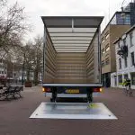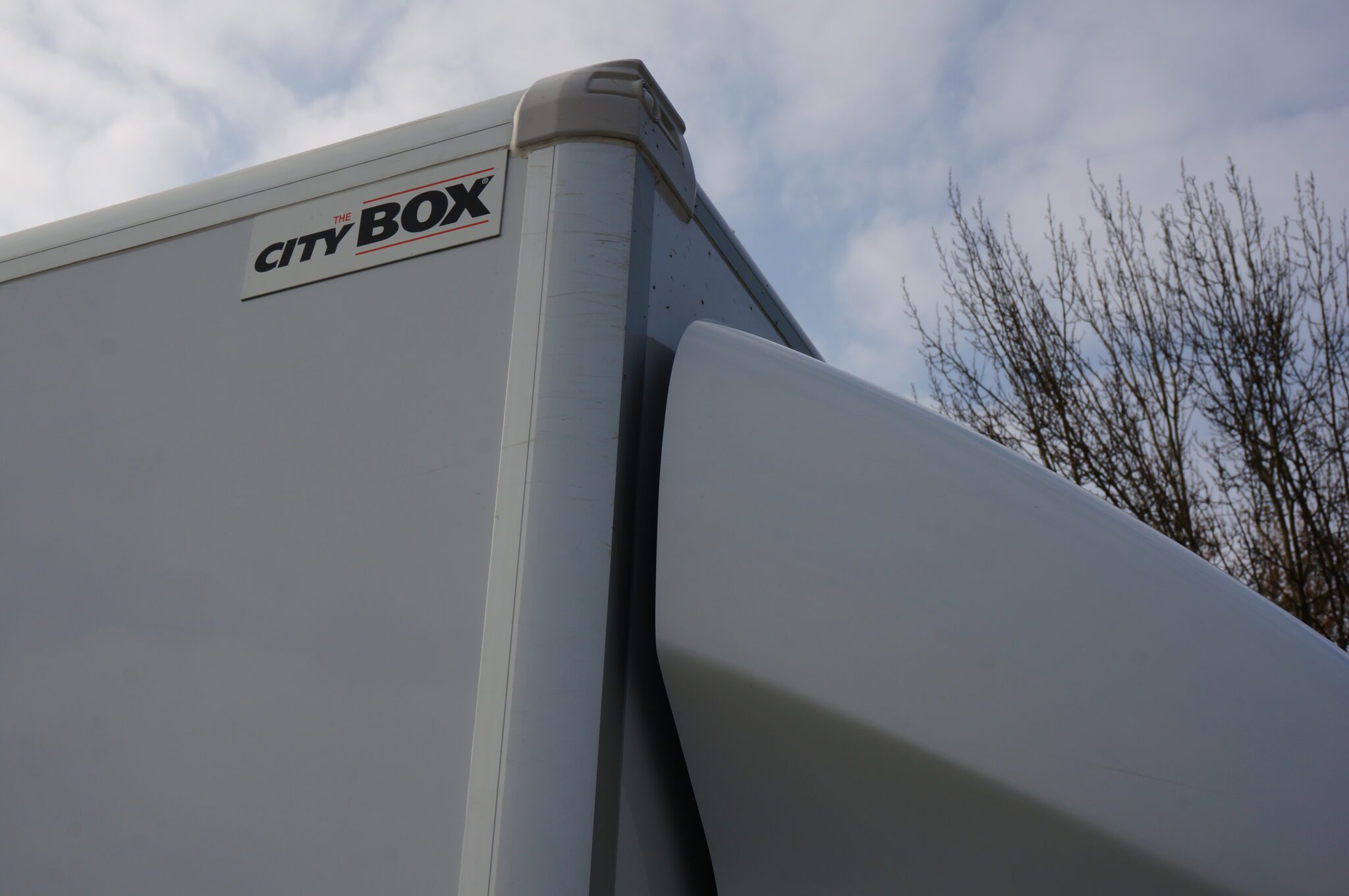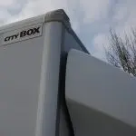 Direct achter de cabine vinden we een mooie opbouw: een CityBox Aluminium, goed voor een laadvolume van maar liefst 20 kubieke meter. De boxopbouw ziet er mooi strak uit, met afgeronde profielen. Voor optimale aerodynamica is een mooie dakspoiler op de cabine gemonteerd. Onder de box is aluminium onderrijbeveiliging gemonteerd, de spiegels van deze Transit zijn extra breed. Wel zo veilig in stedelijk gebied. De boxopbouw heeft twee toegangspunten. Aan de rechterzijde van de CityBox zit een grote, vast te zetten en af te sluiten deur. De achterzijde van de CityBox wordt afgesloten door een dHollandia laadklep. Een stevig en rigide exemplaar. De Box zelf heeft een lichtdoorlatend dak. Dat is fijn overdag, maar in de vroege ochtend kun je het ontbreken van kunstmatig licht wel eens als een nadeel ervaren. Dat is echter ongetwijfeld optioneel te bestellen. Met een laadlengte van 422 cm kunnen er veel lange zaken mee. Het laadvermogen is bij deze configuratie 845 kg. Daar kun je heel veel voor vervoeren, maar wie zware goederen transporteert moet wel waken voor overbelading. De CityBox is aan de binnenzijde voorzien van latbetimmering en horizontale vastzetrails.