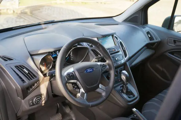 De Ford Transit Connect is geen onbekende. We hebben dit model al vaker getest en roemen nog steeds het weggedrag, comfort en het moderne interieur. Hadden we in het verleden nog kritiek op de drukke middenconsole en het kleine navigatiescherm, met het nieuwe 6 inch kleurennavigatiescherm met touchscreen is het veel beter leven. Het HD-scherm is groter en dichterbij geplaatst. Het omhelst niet alleen de navigatie, maar ook de radio en telefoonbediening. De navigatie is echt sterk verbeterd, met mooie kaartweergave en een eenvoudige bediening. Wel was het even zoeken naar de SD-kaartje dat zich onder de middelste stoel bevindt. Daar bevinden zich ook twee USB-aansluitingen. De telefoon is snel via Bluetooth te koppelen (of via USB) en via SYNC II met spraaksturing te bedienen. Jammer is dat bij de radiobediening er weer veel digitale knoppen verschijnen. Maar ook hier kan de spraaksturing van SYNC II een uitkomst bieden.