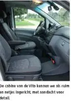 De Mercedes-Benz Vito is natuurlijk geen onbekende. In het kleintransport heeft de kleinste Mercedes besteller, ooit International Van-of-the-Year, zich allang bewezen en is een verkoopsucces. Maar de markt vraagt om permanente vernieuwing, want anders gaat men gapen. DaimlerChrysler reageerde alert en heeft de Vito een opknapbeurt gegeven. Onze testauto had een Design Plus pakket, bestaande uit onder meer bumpers en stootstrips in lakkleur, 16 inch lichtmetalen velgen, een combisysteem met telefoon, navigatie en audio mèt een matrixdisplay, een stuurwiel met flink wat knopjes en een railing op het dak. En het moet gezegd worden: het ‘design’ werkt, want opeens heeft de Vito een meer dan potent voorkomen. De cabine biedt weinig verrassingen. Hij is nog steeds ruim, zeker in combinatie met zijn concurrenten, en de pook (in ons geval van de vijfversnellingsautomaat) zit in het dashboard.
