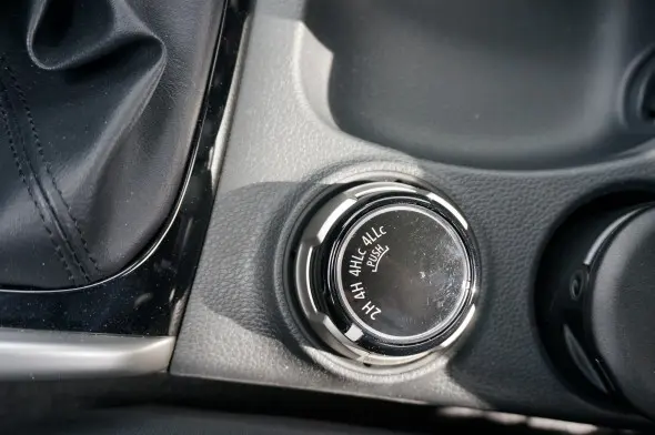 Tussen de voorstoelen vinden we de Super Select inschakelbare vierwielaandrijving. Een eenvoudig te bedienen systeem met vier standen, 2H (alleen achterwielaandrijving) , 4H (vierwielaandrijving voor normale ondergrond bij regen en sneeuw), 4HLc (voor wat ruiger terrein bij hogere snelheden) en 4LLc (voor echt ruig terrein en lage snelheden). We hebben dat natuurlijk geprobeerd op een modderig stuk weiland, waar de L200 met geactiveerde vierwielaandrijving moeiteloos doorheen ploegde. Wie regelmatig een flinke aanhangwagen of paardentrailer moet meenemen zal met de L200 niet snel stil komen te staan, gezien het enorme trekvermogen van 3.000 kg!