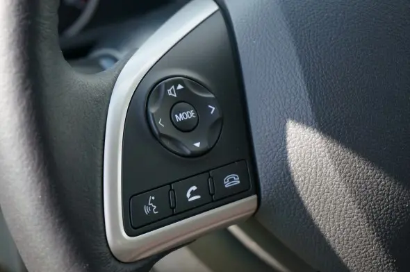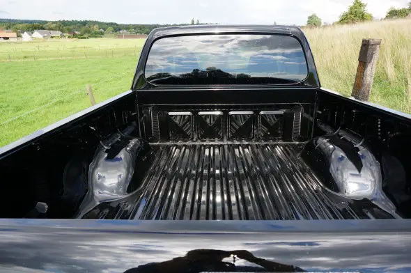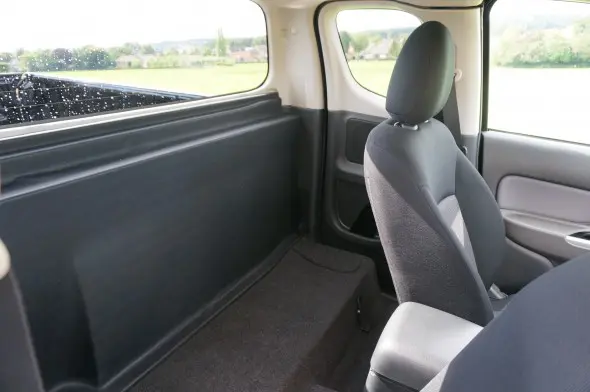 Aan de binnenzijde vinden we twee zitplaatsen en een gestoffeerde ruimte achter de stoelen om bijvoorbeeld een gereedschapskoffer of tassen te plaatsen. Die stoelen zijn eenvoudig naar voren te klappen, maar keren niet terug in de oorspronkelijke stand. Een punt van kritiek wat we vaker tegenkomen bij Aziatische auto’s. Voor de rest bevallen de stoelen goed, zijn comfortabel en bieden genoeg zijdelingse steun. De werkplek is verder luxe te noemen. We zien een verstelbaar lederen stuurwiel met diverse functies (o.a. cruise control), een grote middenconsole met opbergruimte, fraaie in pianolak afgewerkte panelen, climate control en een groot display voor de audio, telefoon en achteruitrijcamera, maar geen navigatie. Met zo’n mooi groot scherm een gemis. Bovendien niet leverbaar op deze Club Cab.