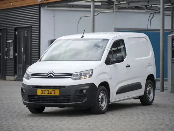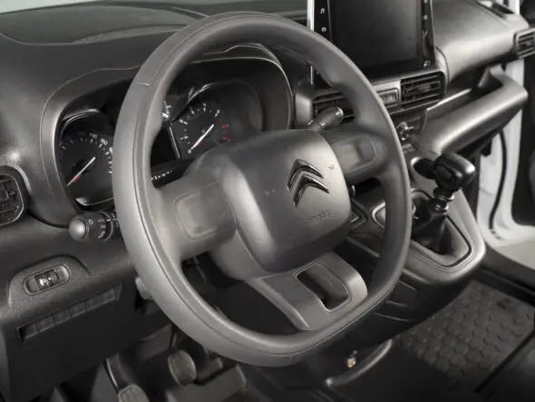 De Citroën Berlingo is misschien wel de meest traditionele bestelauto in deze test. Hij is een no-nonsense rechttoe rechtaan tool, helemaal in de geest van ‘de auto als werktuig’ waarin dit magazine ooit werd opgericht. De Citroën is wit, met standaard 15 inch velgen en eenvoudig uitgevoerd. Dat zie je aan de looks, maar ook aan de prijs. Die is aangenaam laag. De Berlingo komt uit de Stellantis-groep en is ook verkrijgbaar als Fiat, Opel, Peugeot en Toyota. Om toch wat onderscheiding aan te brengen heeft de Citroën een goed ogend eigen uiterlijk gekregen. Tegenwoordig ook als elektrische besteller, maar in deze test heeft de Berlingo een dieselmotor. Een 1.5 BlueHDi van 100 pk. Euro 6d en zo schoon mogelijk, maar toch: een dieselmotor. Die motor presteert prima in handling en verbruik, al hoor je hem natuurlijk wat meer dan een elektrische aandrijving. In het interieur treffen we ook eenvoud. We treffen een handgeschakelde zesversnellingsbak, wat enkel kan bij een auto met verbrandingsmotor, en moeten dus zelf de transmissie bedienen. De Berlingo beschikt dan weer wel over een elektrische handrem. Het stuurwiel heeft geen enkel knopje, een unicum in deze tijd. Aan de stuurkolom zit wel bediening voor cruise-control (standaard) en audio. Op het dashboard van deze Berlingo geen fancy multimedia-systeem. Er zit wel een 8 inch scherm op met DAB+-radio en mogelijkheid voor verbinding met Android Auto en Apple Carplay. Het laadvolume van de Berlingo is oké, het laadvermogen bedraagt 683 kg. Aan de trekhaak mag 1500 kg worden gekoppeld. De Berlingo rijdt zoals hij eruit ziet: klassiek en Frans. Hij helt af en toe een beetje over in de bochten en je kunt de mechanica voelen. Een klassiek gevoel, maar wel vertrouwd. Zorgeloos ook, want bij deze Berlingo hoef je je bij het instappen nooit af te vragen hoeveel kilometer je nog kan rijden. Met een actieradius van 850 km op de 50 liter dieseltank stel je je die vraag maar af en toe. Dat geeft rust voor bestuurder en wagenparkbeheerder.