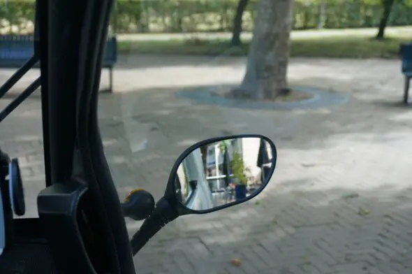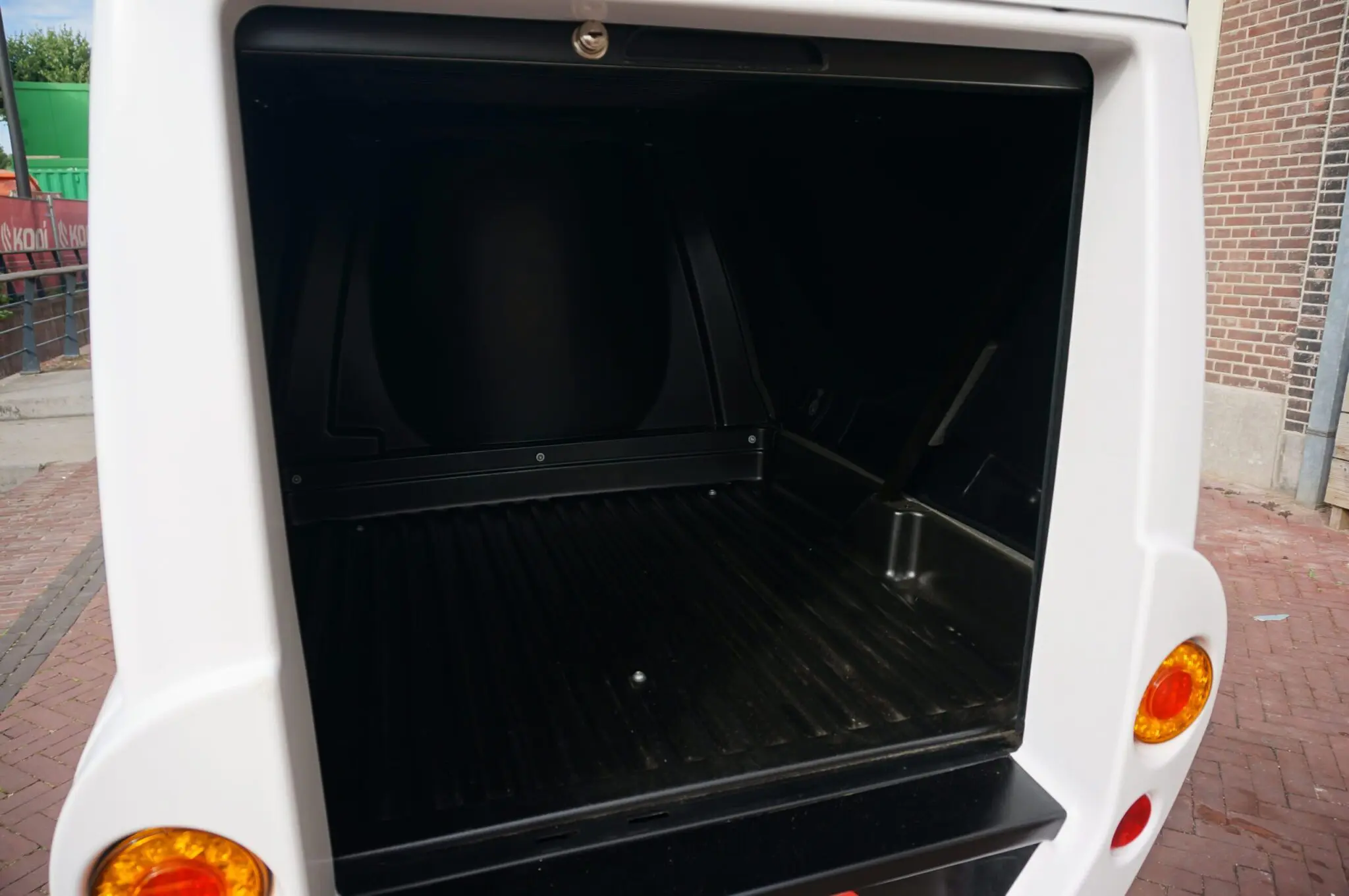 Als bestuurder hebben we in de cabine voldoende ruimte. We moeten wel wennen aan de kleine spiegels. Voor een klein voertuig als dit in principe voldoende, maar heel wat anders de spiegels op een auto. De dode hoek achter de Carver is groot. Een camera zou een optie kunnen zijn. De laadruimte van de Carver Cargo is toegankelijk via een afsluitbaar roldeurtje, is 500 liter groot en heeft een volume van 0,61 m3. Het laadvermogen is afhankelijk van het gewicht van de chauffeur. De Carver weegt zelf 330 kg en mag maximaal 500 kg wegen. Met een lichte chauffeur van 70 kg mag je dan nog 100 kg aan lading meenemen. Dan moet je echt wel zwaar spul in het kleine boxje laden, wil je daar aan komen.