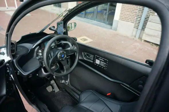 Instappen in de Carver kan via twee deuren, aan beide kanten. In de goed zittende stoel worden we omringd door veel glas en hebben we een prima zicht rondom. Voor ons een gewoon autostuur, een minimalistisch display en een gas- en rempedaal. De Carver heeft een automatische transmissie. De Carver Cargo heeft rond het stuur aardig wat opbergvakjes. Achter de verstelbare stoel vinden we ook nog een groot opbergvak. Er is (optie) een houder voor onze telefoon, die dienst doet als navigatiesysteem. Al rijdend vinden we de Carver aardig comfortabel voor een klein stadsvoertuig. Groot voordeel: op onze 45 km/h versie mag je rijden met een AM-rijbewijs. Verbeterpuntje: de kwaliteit van de veiligheidsgordel, die snel gedraaid zit en dan niet comfortabel is.