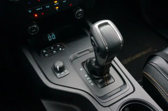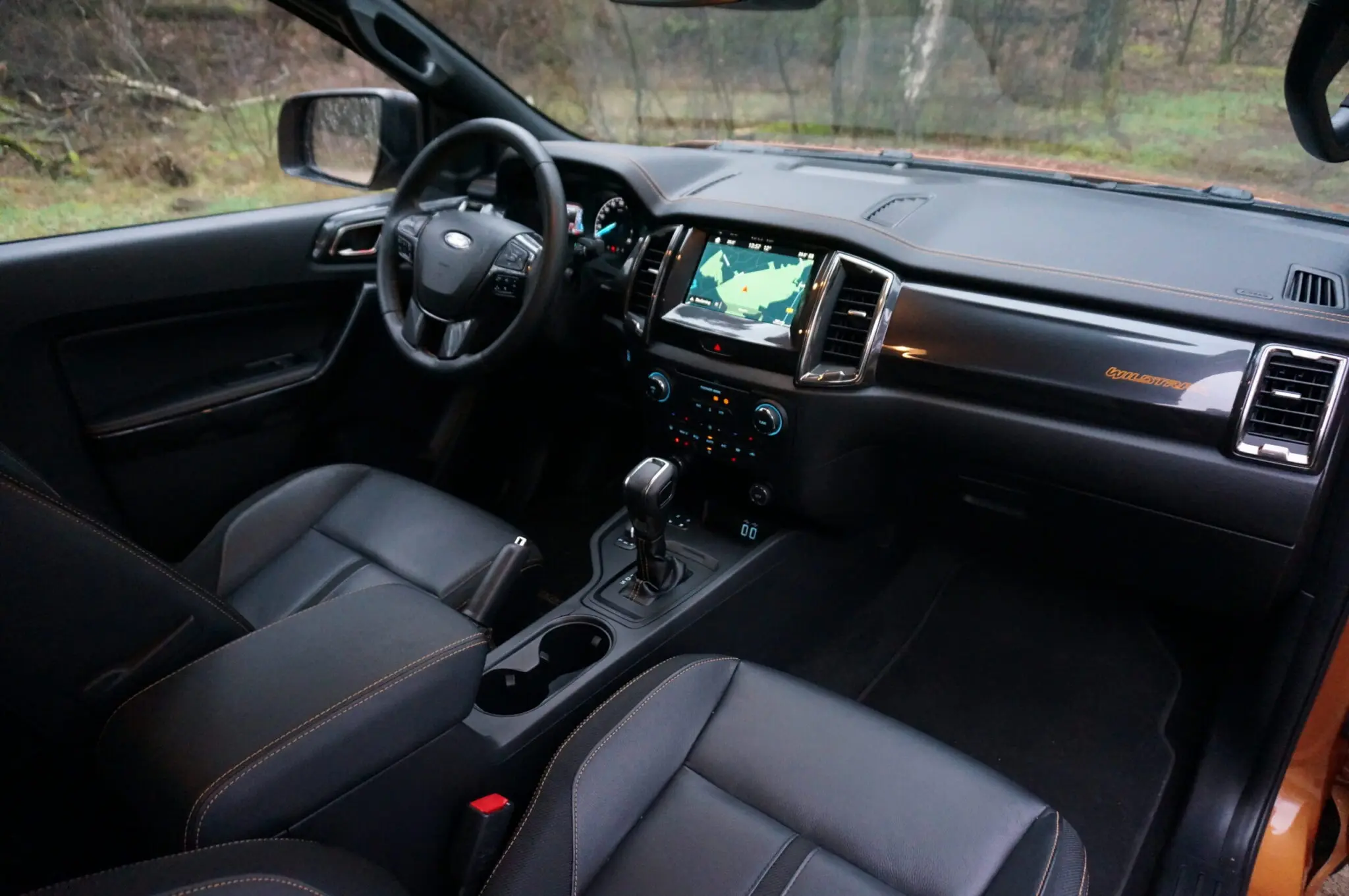 Die signing gaat gewoon door in het interieur, met onder meer de naam Wildtrak in de dorpellijsten, het dashboard en de luxe leren stoelen. Leer zit trouwens ook op het dashboard, net als in de stoelen met contrasterende oranje stiksels. Ook het stuur is met leer bekleed, en het voelt lekker dik en comfortabel aan. Het stuur zit helemaal vol met bedieningsknopjes, zodat je tijdens het rijden eigenlijk nooit de handen van het stuur hoeft te halen. In het midden van het dashboard zit het Sync 3 touchscreen scherm, groot 8 inch. Daar zijn vrij makkelijk alle functies voor bijvoorbeeld navigatie te bedienen. Maar ook connectivity is een sterk punt van de Ranger, met onder meer de Ford Pass app, waarmee autostatus maar ook fleetinfo via de smartphone te raadplegen is. Onder het scherm zit alle bediening voor het interieurklimaat, en op de middenconsole vinden we allereerst de knoppen om te schakelen tussen 2Hoog,4Hoog en 4Laag, want natuurlijk heeft deze Ranger vierwielaandrijving. Hill Ascent zorgt ervoor dat we heel beheerst kunnen afdalen in het terrein. Vrij prominent aanwezig in de middenconsole is de grote pook voor automaat. Die transmissie heeft maar liefst 10 gangen. Dat lijkt veel, maar straks zullen we zien waarom dat is. De Ranger is van binnen keurig afgewerkt, met een airco-gekoeld kastje in de middenarmsteun. De Ford is verder voorzien van handigheidjes als twee 12 V aansluitingen, dubbele USB-poorten en zelfs een heuse 230V aansluiting!