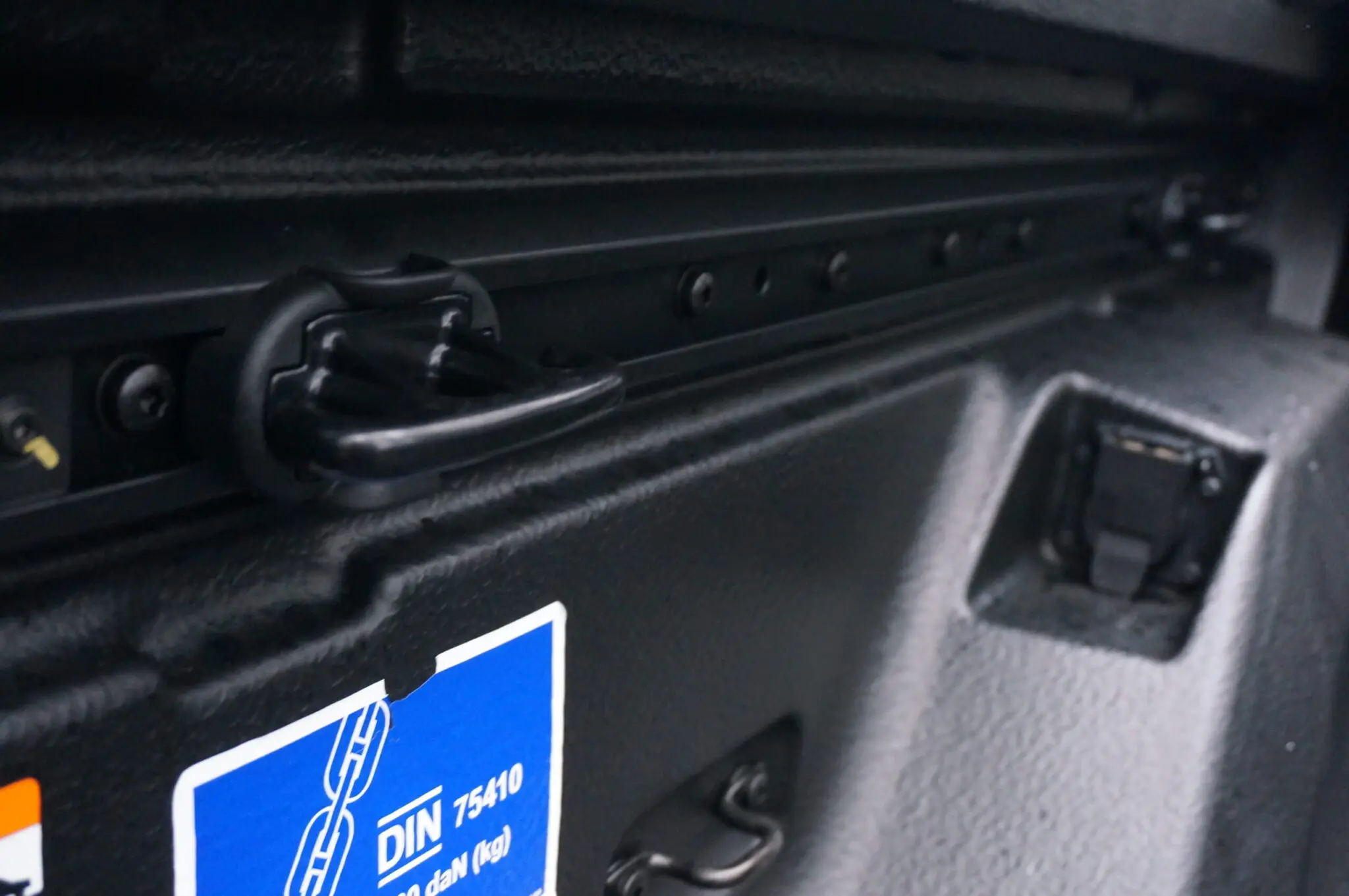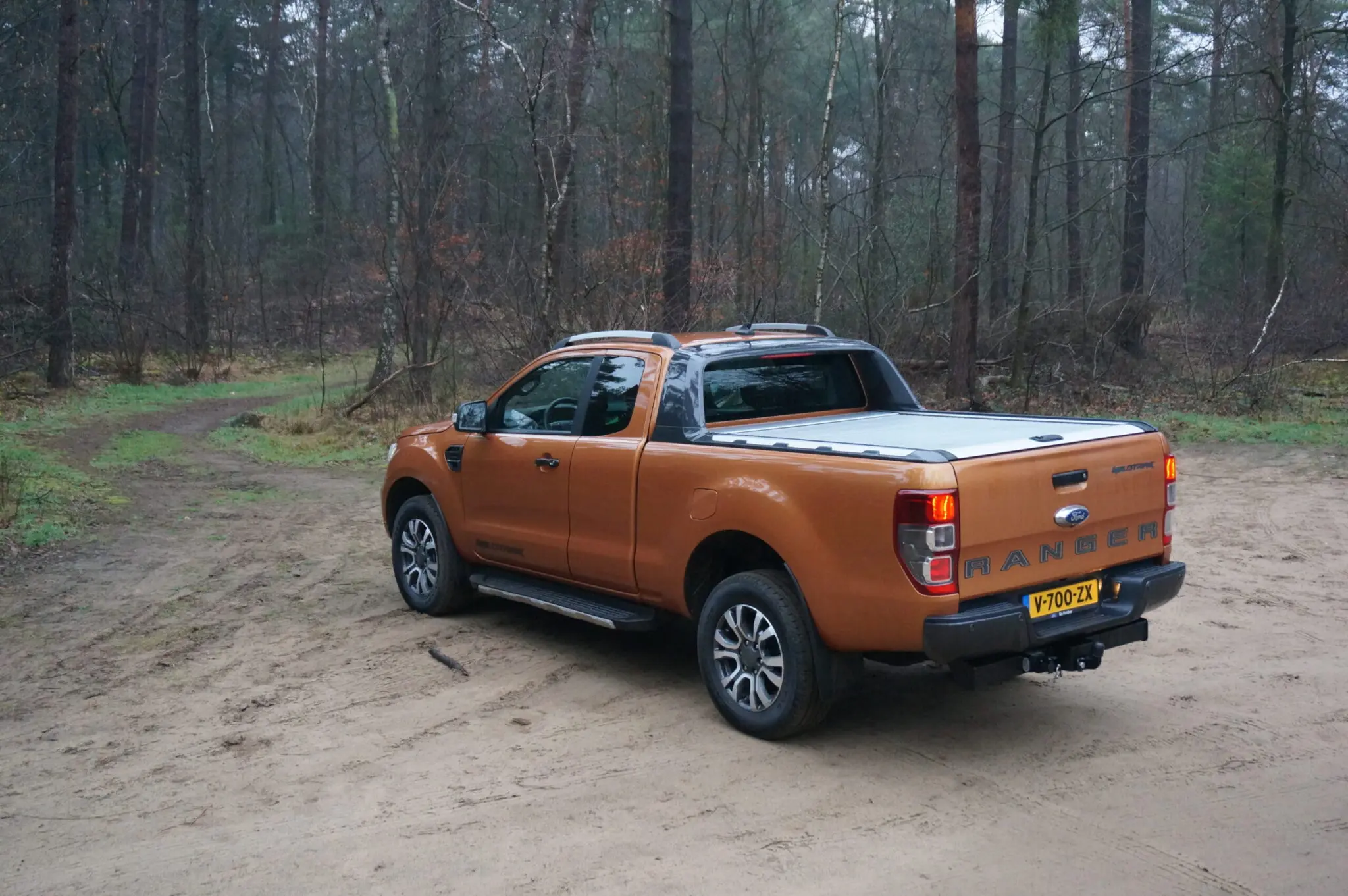 De meeste opbergruimte is te vinden achter de stoelen. De Ford Ranger Wildtrak in deze test is namelijk een Supercab, met ‘anderhalve cabine’. Een enkele cabine is in Nederland niet verkrijgbaar, een dubbele cabine (dus met achterbank) ook niet. Diverse concurrenten bieden wel een dubbele cabine, met een verlenging die BPM-korting mogelijk maakt, maar Ford heeft daar met de Ranger tot op heden nooit aan gewild. Dus moeten we het doen met de Ranger met naast de gewone deuren ‘suicide doors’, halve deuren die tegengesteld met de deuren openen en toegang geven tot de ruimte achter voorstoelen. Daar is nog zo’n 50 cm ruimte beschikbaar, met twee afsluitbare opbergplekken. De laadbak van de Ranger is groot, met 172 cm laadlengte. De laadhoogte is 51 cm en wordt beperkt door de Wildtrak Rollertop. Een prima afdekking van de laadruimte, maar de bediening is niet erg duidelijk. Daar moet je echt even op studeren, en doe dat maar, want anders bezeer je je makkelijk aan het mechanisme. In de laadbak mag 1068 kg aan lading mee. Aan de optionele trekhaak mag 3,5 ton hangen!