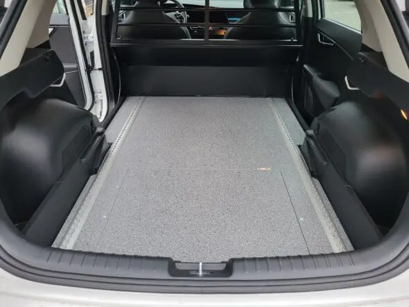 Kijken we vanaf de bestuurderstoel over de rechterschouder, dan zien we geen tussenschot. Wel zien we een hekwerk, dat vastzit aan een metalen frame. Onze Kia Niro is standaard voorzien van een ombouwkit, die van de personenauto een bedrijfsauto maakt. Het frame strekt zich uit van de ruimte achter de voorstoelen tot de achterklep. In samenwerking met Veth Automotive is er een laadvloer gecreëerd van 157 cm lang. We meten ook de hoogte en de breedte van de laadruimte en komen uit op een laadvolume van net geen twee kuub. Het laadvermogen bedraagt 543 kg. Met de achterklep omhoog is de laadruimte goed toegankelijk. De tilhoogte is met 75 centimeter wel fors, en lading moet over de 17 cm hoge tildrempel worden getild. De achterste zijdeuren bieden ook toegang tot de laadruimte en zijn 62 cm breed en 81 cm hoog. Veth en Kia hebben er wat fraais van gemaakt, met een mooie houten laadvloer inclusief bindrails. In de vloer zit nog een bergruimte waar een krik en wat ladingzekering in past, plus eventueel de laadkabel. Onze Kia EV Niro Cargo was al uitgerust met deze laadruimte,  de ombouwkit is ook leverbaar voor een personenversie van de Niro. De basiskit kost 1.990 euro en de Prokit van onze testauto kost 2.680 euro.