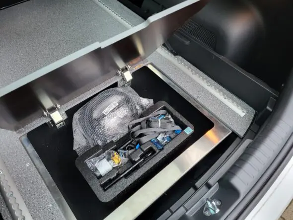 Maar voor nu moeten we het doen met de Kia EV Niro Cargo, die we van Kia Nederland in bruikleen kregen. Helemaal geen straf, want de Niro is net vernieuwd en uiterst modern. De midsize-SUV is 442 cm lang en vlot vormgegeven. Op ons model wordt de witte lak afgewisseld met zwarte accenten. De LED-dagrijverlichting is fraai, de 17 inch lichtmetalen wielen ook. Recht onder het logo aan de voorkant zit de aansluiting voor de laadstekker. Mooie plek, maar het betekent wel dat je altijd achteruit moet wegrijden bij een laadpaal. Onder wat we vroeger de motorkap noemden vinden we naast wat elektrische elementen een echte frunk: niet supergroot maar groot genoeg om de laadkabel netjes in op te bergen.