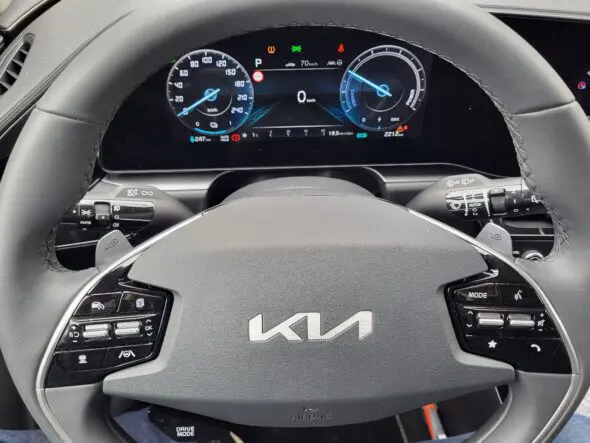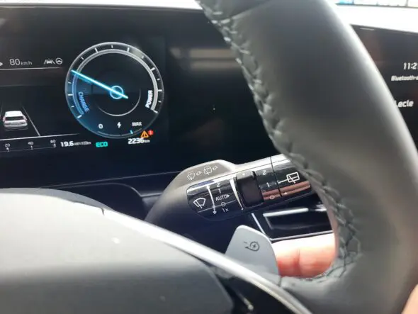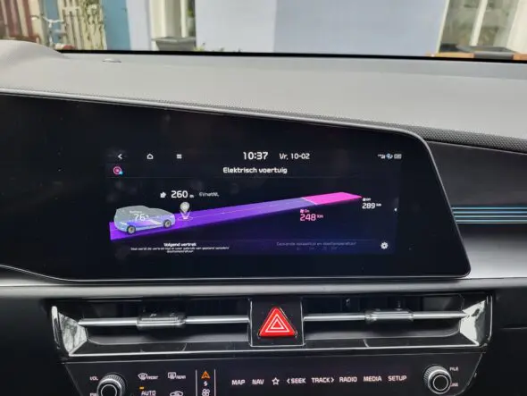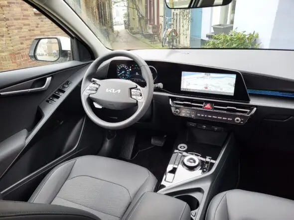 Tijdens onze rit merken we dat de Kia uitstekend rijdt. Hij weegt 1657 kg maar voelt niet zwaar, wel stabiel. Omdat er geen tussenschot en achterbank is wordt de laadruimte een soort klankkast. Het is niet lawaaiig in de NIro maar stil als andere EV’s is hij ook niet.