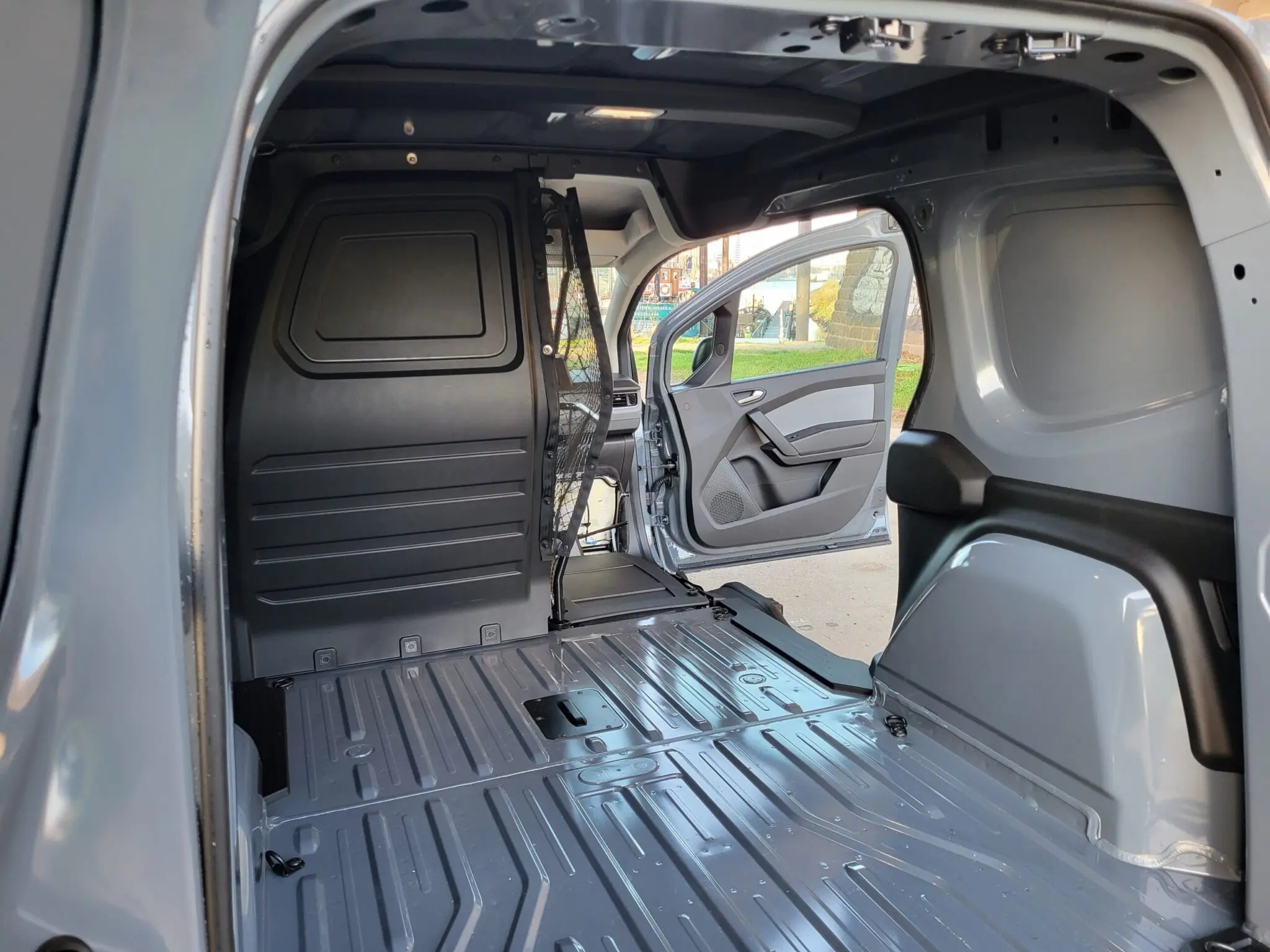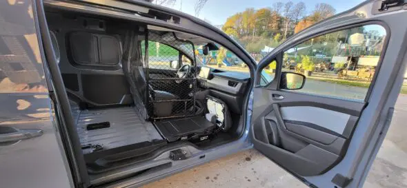 Het grote nieuws van de nieuwe Kangoo was Open Sesame. Daarbij is de B-stijl aan de rechterkant van de Kangoo verwijderd, waardoor er een bijzonder grote toegang ontstaat tussen laadruimte en passagierscompartiment. Om dat goed te gebruiken is er een tussenschot nodig met een wegklapbaar rek. Volgens de NL’se wetgeving is er met een niet volledig tussenschot een BPM-plicht. Daarom is Open Sesame niet op de diesel-Kangoo verkrijgbaar, maar de E-TECH Electric is vrijgesteld van BPM, ook met Open Sesame. Het biedt behalve een uitstekende toegang vanaf de rechterkant ook een totale laadlengte van 295 cm, doordat de passagiersstoel helemaal is weg te klappen. Een briljante vondst, die met de Kangoo E-TECH Electric goed konden uitproberen. De dimensies van de laadruimte zijn gelijk aan die van de dieselversie. Het laadvermogen bedraagt 610 kg, aan de trekhaak mag maar liefst 1500 kg.