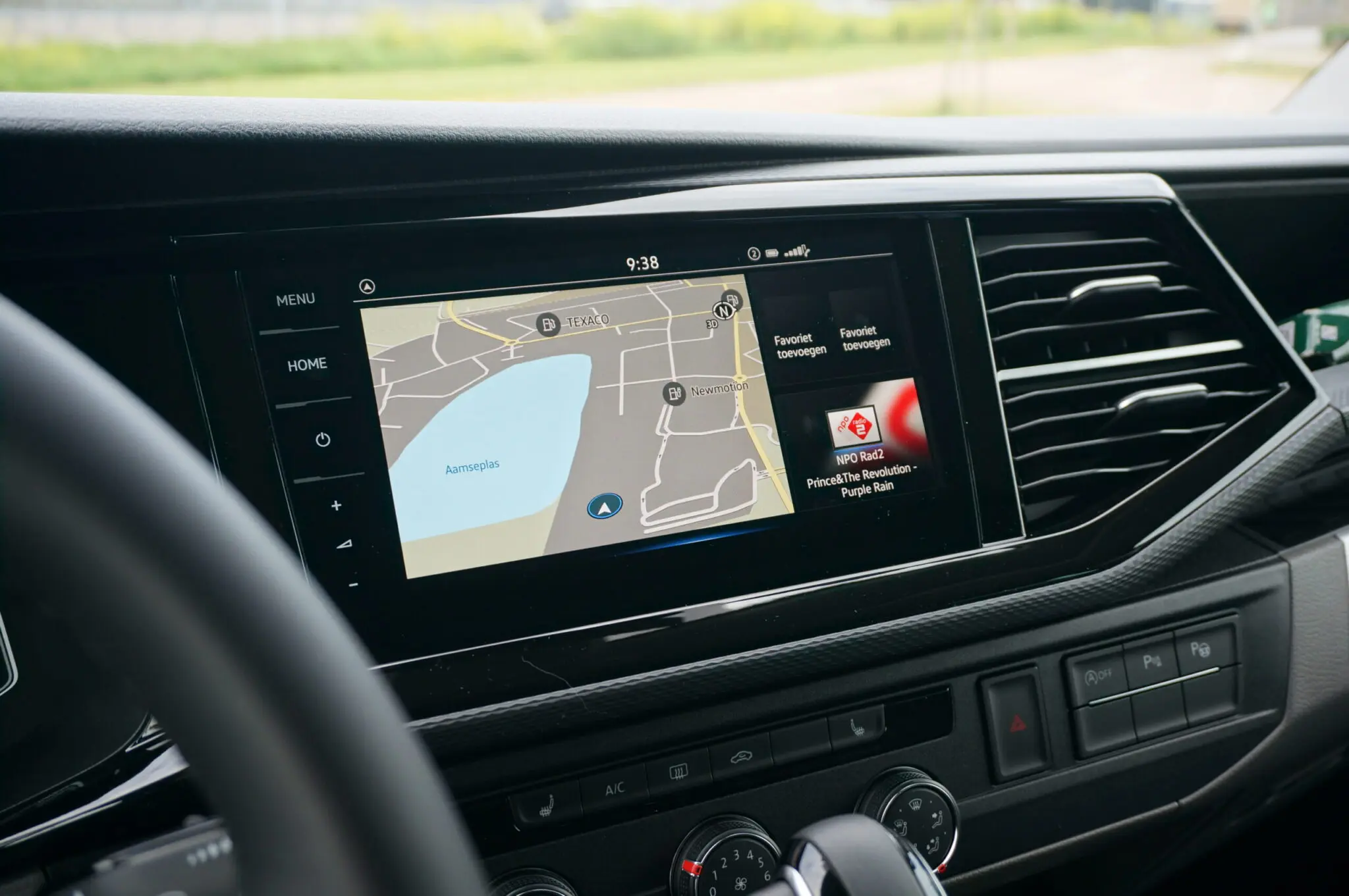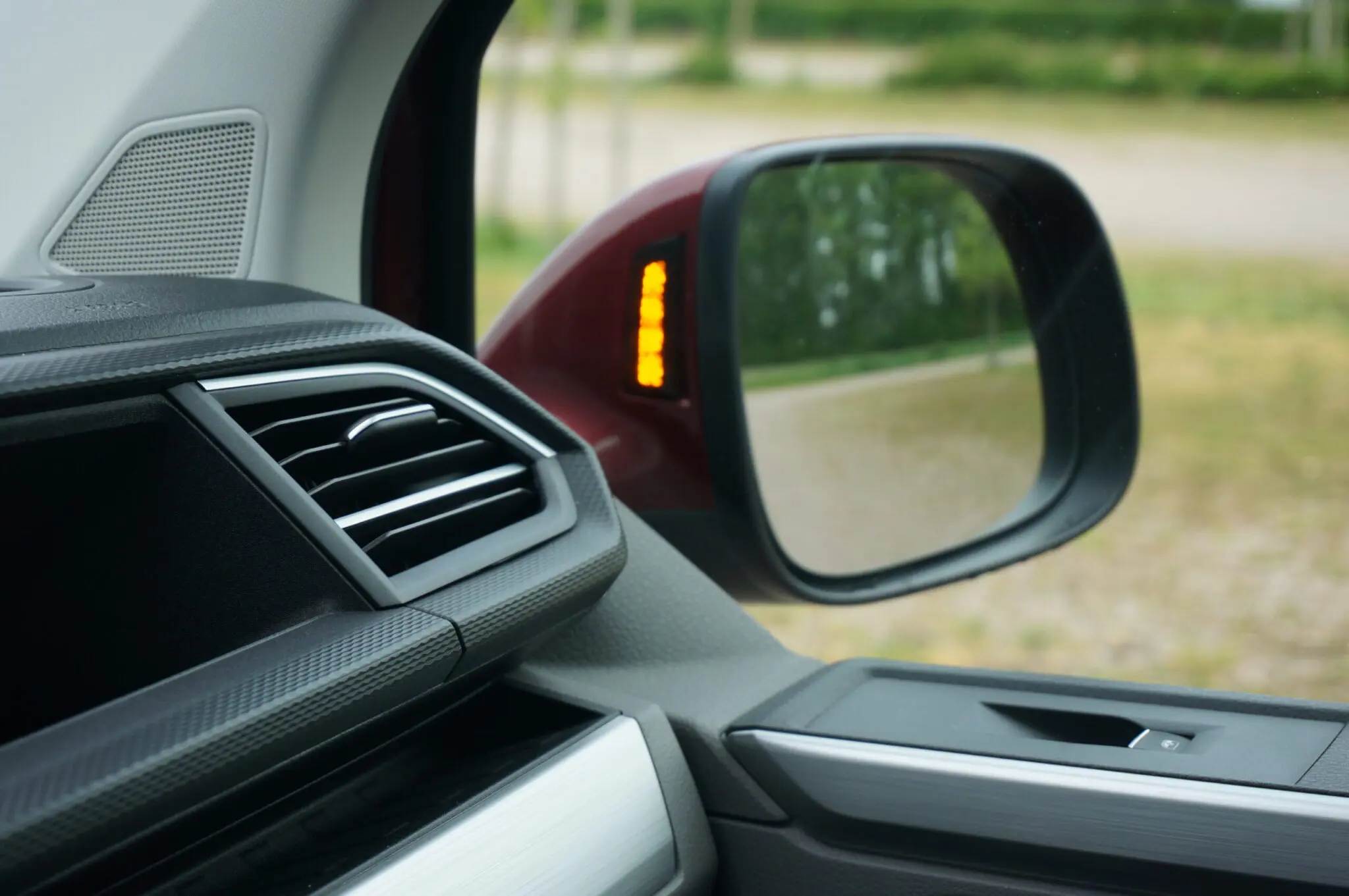 Het meest opvallend in het dashboard is het grote scherm in rechts van het stuur, bedoeld voor bediening van navigatie en multimedia. Niet langer is dat scherm gelardeerd met knopjes, maar het is allemaal touch-buttons wat de klok slaat. Het systeem laat zich makkelijk bedienen. Gezeten achter het stuur zien we nog een scherm voor ons, namelijk als instrumentendisplay. Optioneel is het hele instrumentarium digitaal, en met de knop ‘View’ op het stuurwiel kan de bestuurder schakelen tussen verschillende infodisplays. Het navischerm blijft daarbij altijd zichtbaar, met naar keuze links en rechts infodisplays over de auto of de snelheids- en toerentalmeters. De mooiste optie vonden wij om het navigatiescherm breeduit over het hele display te laten zien. Daarmee is het tijdens het rijden veel makkelijker even te checken waar je heen moet. Tijdens het rijden valt de dodehoekassistent goed op. Die is verwerkt in de spiegels van de T6.1, maar niet in het glas, zoals bij andere merken, maar aan de binnenzijde van de spiegelbehuizing. Daardoor valt het oplichtende lampje altijd op, want het zit aan de schaduwzijde.