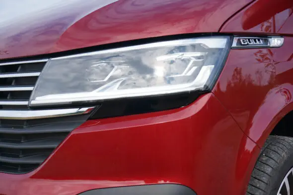 Een beetje argwaan is wel op zijn plek, want kijk je naar het uiterlijk van de T6.1, dan zie je echt maar weinig verschil met de T6. Er zit een zwarte knobbel op het dak van onze in Fortune Red gespoten T6.1. Da’s een sensorunit voor tal van elektronische hulpsystemen. De grille van de T6.1 is vernieuwd en in onze luxe versie zien we veel chroom in grille en bumper en ook LED-koplampen, inclusief LED dagrijverlichting. Onze Transporter is uitgevoerd als Bulli en dat is dan ook te zien op de typeplaatjes aan de zijkant van de koplampen.