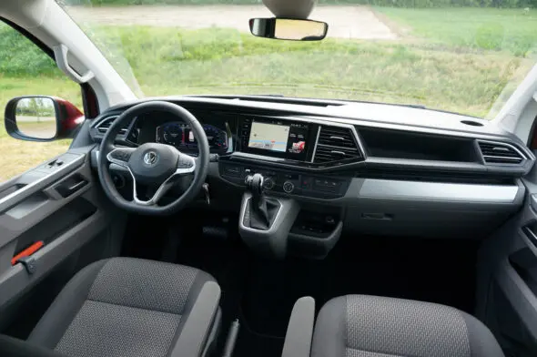 Onze testauto was voorzien van een 2.0 TDI dieselmotor, natuurlijk voldoende aan de nieuwste Euro 6 -norm. Hij levert maar liefst 199 pk, dus om vermogen zit je nooit verlegen. De DSG7-automatische transmissie kan al die paardenkrachten prima aan. Het blijft te allen tijde ook heel stil aan boord en het onderstel van deze Bulli zorgt voor een uiterst aangenaam weggedrag. Het is niet voor niets dat je met een ‘busje’ als dit ook prima VIP-vervoer kan exploiteren. Het brandstofverbruik van 1 liter op 14 km is niet top, maar daarvoor rijden we wel rond met bijna 200 pk. De T6.1 stuurt fijn dankzij de elektromechanische stuurbekrachtiging. Daarmee maakt VW een hele reeks rijhulpsystemen mogelijk op de Transporter. Zo is er Lane Assist, Park Assist en Trailer Assist, wat parkeren met zowel met als zonder aanhanger vergemakkelijkt. Verder helpt Rear Traffic Alert bij het achterwaarts verlaten van een parkeerplaats. Road Sign Display helpt bij het herkennen van de geldende verkeersregels. Standaard op de T6.1 zitten het Cross Wind Assist-systeem, het Post-Collision remsysteem en Hill Start Assist.