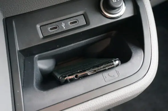 Dan maar ’s binnen kijken. Ook daar is het luxe, met tapijt op de vloer, ook in de dubbele cabine. We weten niet of dat de beste optie is als je weleens op vieze bedrijfsterreinen komt. Je neemt er onder de schoenen zo wat van mee de auto in en dan blijf je het tapijt schrobben… De stoelen in de T6.1 zijn comfortabel en goed te verstellen. De stoelbekleding ‘Bricks’ hoort ook al bij het Bulli-pakket. De T6.1 heeft een nieuw dashboard gekregen. Het is iets dynamischer dan voorheen en naar wij horen afgeleid van de Passat personenauto. Fraai zijn de opbergvakken op het dashboard; er is daar ook plek voor twee bekerhouders. In het dashboard, vooral aan de passagierskant, zijn kleine sleuven aangebracht waar je een pen of een telefoon kwijt kant. De smartphone plaats je het liefste in het bakje rechts naast de pook van de DSG7-automaat, want daarin wordt hij draadloos opgeladen.