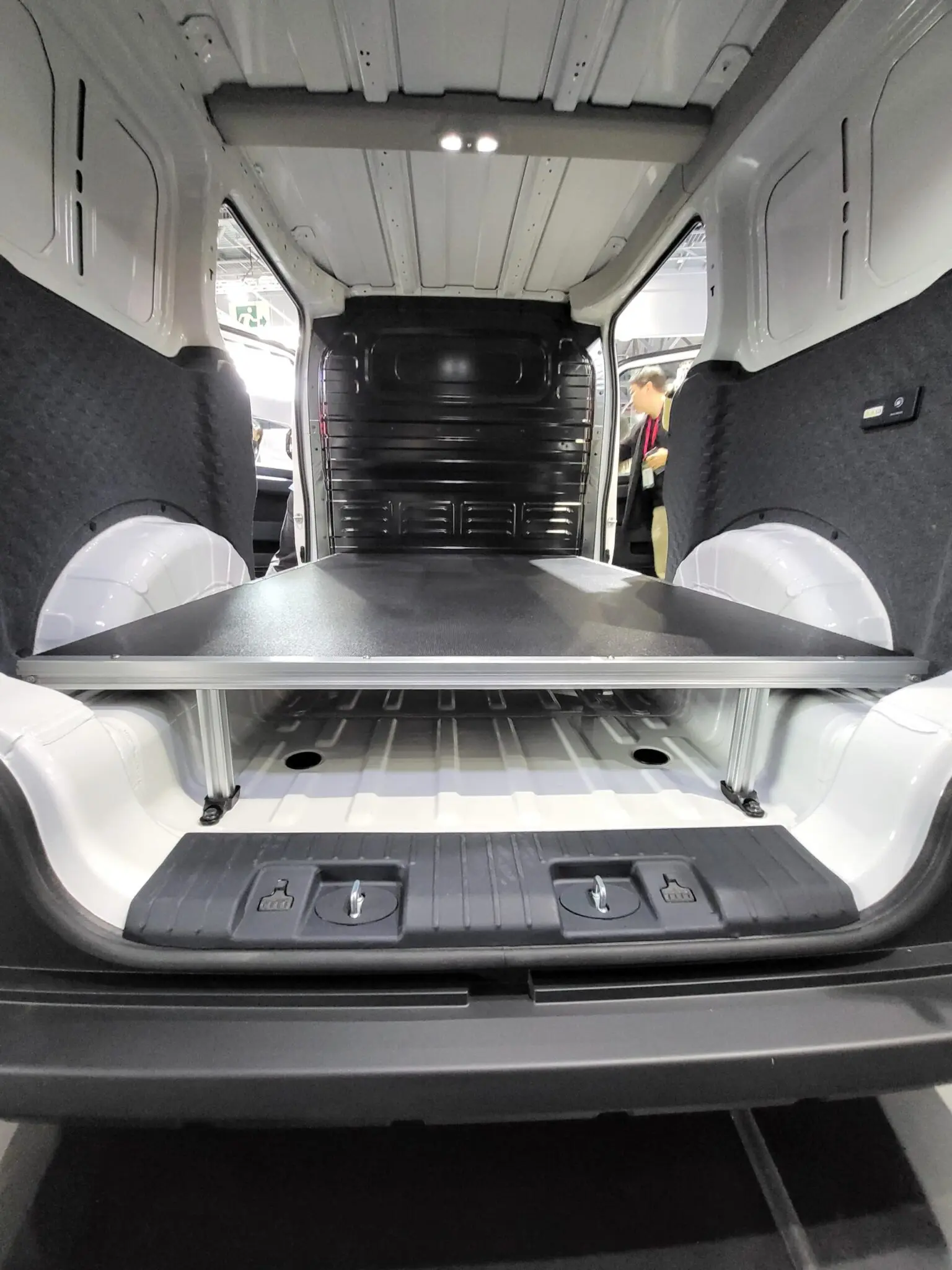 In de cabine vinden we een ontwerp en functionaliteit die we kennen van de Kia personenauto’s. Als we er kort in mogen zitten, merken dat het met ergonomie en functionaliteit wel goed zit. Dat proberen we graag langer uit tijdens een testrit. Maar eerst kijken we in de laadruimte, want daar is iets bijzonders aan de hand. De PV5 Cargo blijkt een onregelmatig gevormde wagenvloer te hebben, waarbij een extra ‘trap’ vanaf de wielkast doorloopt tot de achterkant van de bagageruimte. “Dat verdient wat extra toelichting”, zegt Kia’s Nederlandse COO Sjoerd Knipping daarover. “We hebben ons gericht op een lage instap van 43 centimeter tussen de wielkasten, die voor specifieke gebruikers erg welkom is.” Dat zal zeker zo zijn, maar het geeft ook beperkingen. De twee europallets die in de 225 cm lange, 156 cm brede en 144 cm hoge laadruimte passen, kunnen niet allebei in de breedte worden geplaatst. Eentje in de breedte bij de zijdeur(en), de ander in de lengte tussen de verlengde wielkasten. Wie echt een vlakke vloer wenst, kan van Kia een verhoogde houten vloer krijgen, zo zien we op de Seoul Motorshow. De tilhoogte gaat dan echter van 43 cm naar 68 cm. We vragen ons ook af wat inbouwers van de niet vlakke vloer vinden, al is Kia al lang met ombouwers in contact over de mogelijkheden van de PV5 Cargo. Bij het weer sluiten van de achterdeuren zien we ook nog dat de slotogen ver naar buiten en omlaag steken. Dat neemt niet alleen laadhoogte weg, je loopt ook het risico op een pijnlijke confrontatie met je hoofd.