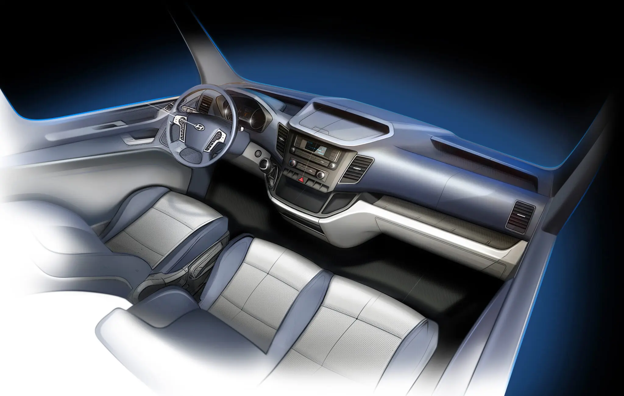 De nieuwe bestelauto is gebaseerd op een platform waar drie carrosserieën op passen: een gesloten bestelauto, een personenbus en een chassis-cabine. Het design van de H350 lijkt wel wat op dat van de Hyundai personenauto’s. De tekeningen die u hier ziet laten een strak design zien. De H350 heeft bijvoorbeeld sierlijke koplampen inclusief LED dagrijverlichting. De carrosserievorm doet wel heel veel denken aan de Mercedes-Benz Sprinter. Het interieur ziet er eveneens strak ontworpen uit. Hyundai heeft veel bergruimte in het dashboard gebouwd, inclusief een groot A4 documentenvak. De laadruimte moet tot 1,4 ton lading mee kunnen nemen, de auto heeft tot 2,5 ton aanhangwagengewicht.