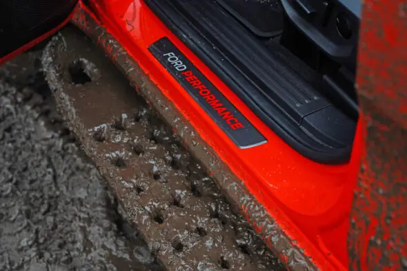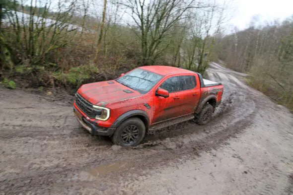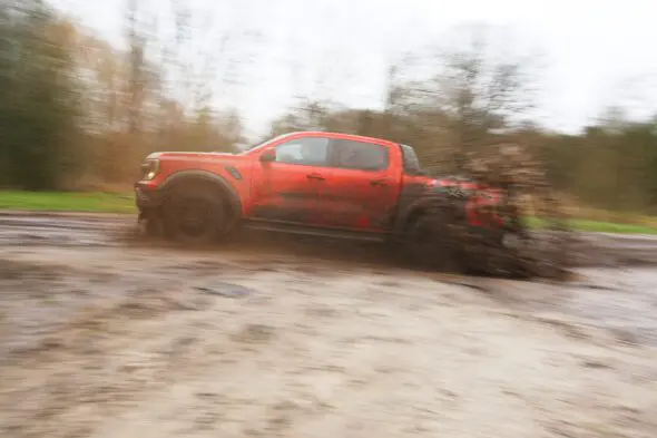 Op Experience Island kun je prima rallyrijden met de Ranger Raptor, maar als wij aankomen heeft het geregend en zelfs gesneeuwd. Het hele terrein is modderig en glad. Het is daarom voorzichtig manoeuvreren met de Ranger Raptor, met de rijmodus Mud/Snow. Onder de motorkap ligt de meest krachtige motor mogelijk: de 3.0 V6 benzinemotor, goed voor 291 pk. Een beest van een motor, maar vooralsnog kruipen wij door de modder. Ook daar laat de Ranger Raptor echter zien een echte off-roader te zijn. Door het verfijnde onderstel kunnen we precies aanvoelen wat er met de auto gebeurt en rijden we toch met aangenaam gemak door de blubber. Fijn is dat we met camera’s rondom de auto kunnen kijken en nog beter onze plek op de weg (of wat daarvoor moet doorgaan) kunnen bepalen. Trouwens, wie 291 pk en een V6 wat veel vindt, kan vanaf halverwege dit jaar ook kiezen voor een 2.0 liter EcoBlue dieselmotor.