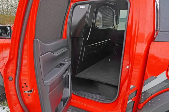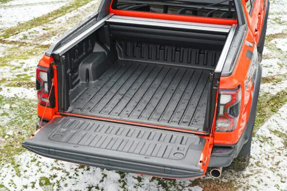 Als we op een droge plek even stoppen kijken we nogmaals in de laadruimte. De rollcover kan inmiddels door alle opgespatte zand en modder amper meer open, maar in de laadbak zien we wel twee slimme power-aansluitingen, goed voor 400 W. Ook is gedacht aan een mobiele werkbank, een geïntegreerde instap in de laadklep en zone-lighting.