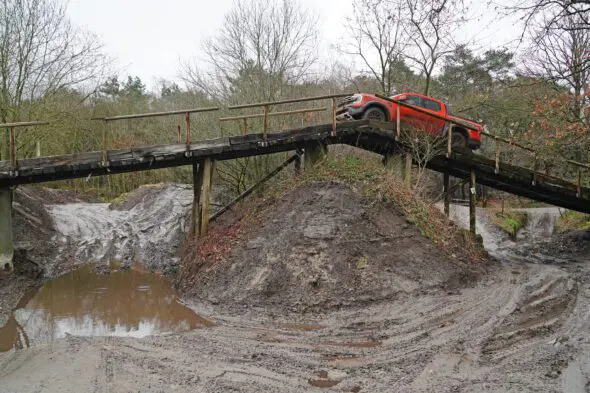 Bij een houten brug kunnen we met de modus Rock Crawl letterlijk naar boven kruipen, en bovenaan weer langzaam naar beneden. Deze Ranger Raptor zit barstensvol elektronica, maar het is dan ook wel zo prettig dat hij zelf aanvoelt hoe hij het beste kan afdalen. Verderop in het terrein gaan we weer over op Mud/Snow en kunnen het sperdifferentieel op zowel de voor- als achteras blokkeren. De nieuwe Ranger Raptor is ook voorzien van Trail Control. Een soort cruisecontrol voor in het terrein. De bestuurder kan eenvoudig een snelheid tot 32 km/u instellen, waarna de auto het versnellen en vertragen zelf regelt terwijl de bestuurder zich kan concentreren op het sturen in moeilijk terrein. We hebben geen tijd om dit uit te proberen, maar doet dat alsnog graag een keertje in een test.