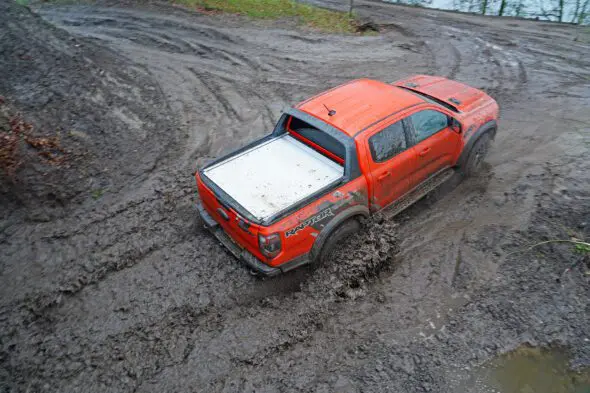 Voordat we gaan rijden, lopen we eerst even een rondje rond de oranje Ranger Raptors die Ford voor ons heeft geparkeerd op het 4×4-paradijs Experience Island in Loon op Zand. Met zijn hoge neus en de letters FORD in de grille lijkt de Ranger Raptor als twee druppels water op zijn Amerikaanse broer de F150. Hij is 538 cm lang, 221 cm breed en met 193 cm hoogte kan hij in theorie in veel parkeergarages worden geparkeerd. De Ranger Raptor heeft met grote, uitgebouwde wielkasten en treeplanken een stoer voorkomen. De LED-koplampen dragen daar ook aan bij. We zien vier deuren in de Ranger Raptor, maar op de plek waar je een achterbank verwacht komt een extra bergruimte, om te voldoen aan onze strenge grijs-kentekenwetgeving. De laadbak is in ons geval afgesloten met een mooie rollcover. Eronder vinden we een 154 cm lange laadruimte. Er mag 756 kg aan lading mee. Wie een trekhaak monteert mag 2,5 ton trekken. Zelf weegt de Ranger Raptor 2474 kg. Wat je zo op het eerste gezicht niet ziet, is dat de Ranger Raptor een ander chassis heeft dan de normale Ranger. Het is veel robuuster en voorzien van speciale wielophanging aan de voor- en achteras. Rechtstreeks afkomstig van race-afdeling Ford Performance zijn de Fox Live Valve schokdempers.
