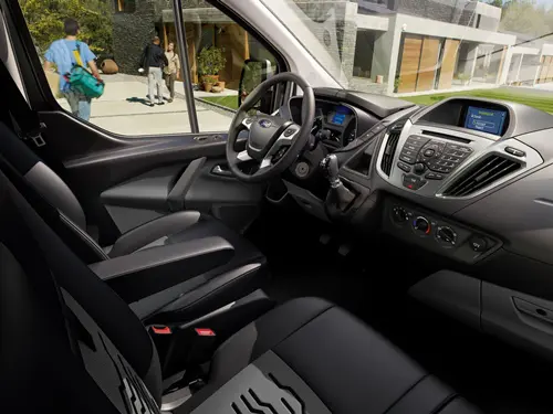 kit, bestaande uit een sportieve voorbumper, zijskirts en wielkastverbreders in carrosseriekleur. Deze sportieve Transit Custom is tevens voorzien van 18-inch lichtmetalen velgen en 235/50 banden. De stoelen zijn met leder en stof bekleed.