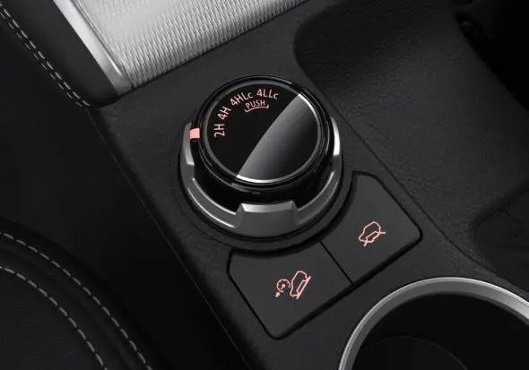 Wie al bekend is met de L200 kan in het interieur een aha-erlebnis krijgen: daar is namelijk niet zoveel veranderd. De luchtroosters en het schakelpaneel hebben een nieuwe omlijsting gekregen en er is wat zachter, comfortabel aanvoelend materiaal gebruikt. Tussen de stoelen vinden we een druk- en draaiknop voor 4WD-selectie. De 4WD-versies van de Mitsubishi L200 zijn uitgerust met Super-Select 4WD voor optimale tractie en rijeigenschappen op elk type ondergrond, of Easy-Select 4WD waarmee eenvoudig kan worden geschakeld tussen verschillende rijmodi voor verschillende typen ondergrond. Dat zijn Sand, Gravel, Mud/Snow en Rock. Die laatste is alleen in 4LLc-stand te gebruiken. De Off-roadmodus stuurt het motorvermogen, de transmissie en de remmen aan om de hoeveelheid wielslip te regelen, de prestaties in het terrein te optimaliseren en tractie in sneeuw en modder te vergroten. Nieuw is ook Hill Descent Control, voor gecontroleerd afdalen van steile hellingen.
