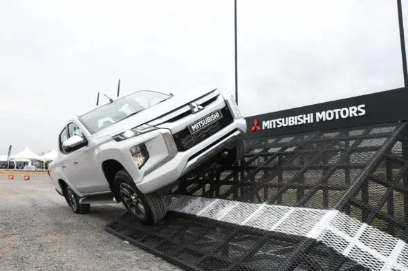 Bestelauto kan kort met de nieuwe L200 rijden. Dat gebeurt op een kunstmatige off-road course. De rit met de L200 duurt maar enkele minuten, maar is lang genoeg om te merken dat het weggedrag van de L200 verbeterd is door de aanpassingen in het onderstel. Met enkele rake offroad-proefjes merken we dat de 4WD-capaciteiten van de L200 nog altijd prima zijn. Hill Descent Control kunnen we uitproberen op een 5 meter hoge ramp. Wij halen de voet van de rem en de L200 daalt op eigen kracht moeiteloos naar beneden. De kennismaking is maar kort en we zetten die graag nog eens voort in een echt off-road terrein, en dat mag ook gewoon hier in Nederland. In het terrein hebben we nu niet goed kennis kunnen maken met de nieuwe veiligheidssystemen van de L200, en dat zijn er nogal wat. Zo is er, Forward Collision Mitigation (FCM), dat voertuigen en voetgangers kan detecteren; Blind Spot Warning (BSW met LCA) dat bij het wisselen van rijstrook waarschuwt voor weggebruikers in de dode hoek met behulp van een waarschuwingstoon en knipperlicht in de buitenspiegel; Rear Cross Traffic Alert (RCTA), dat op dezelfde wijze waarschuwt voor kruisend verkeer tijdens achteruitrijden en Ultrasonic Misacceleration Mitigation System (UMS), dat helpt ongelukken te voorkomen door verkeerd gebruik van het gaspedaal in krappe ruimtes tegen te gaan, bijvoorbeeld in een parkeergarage.