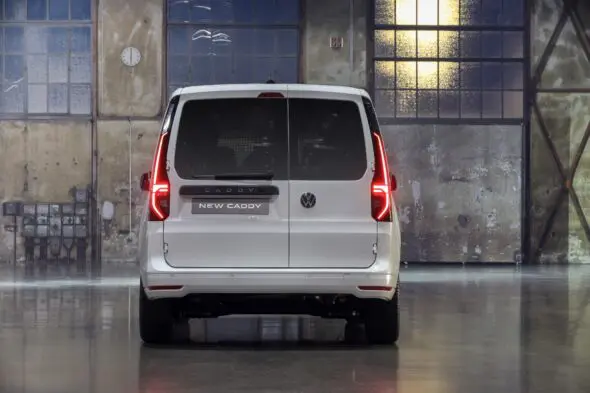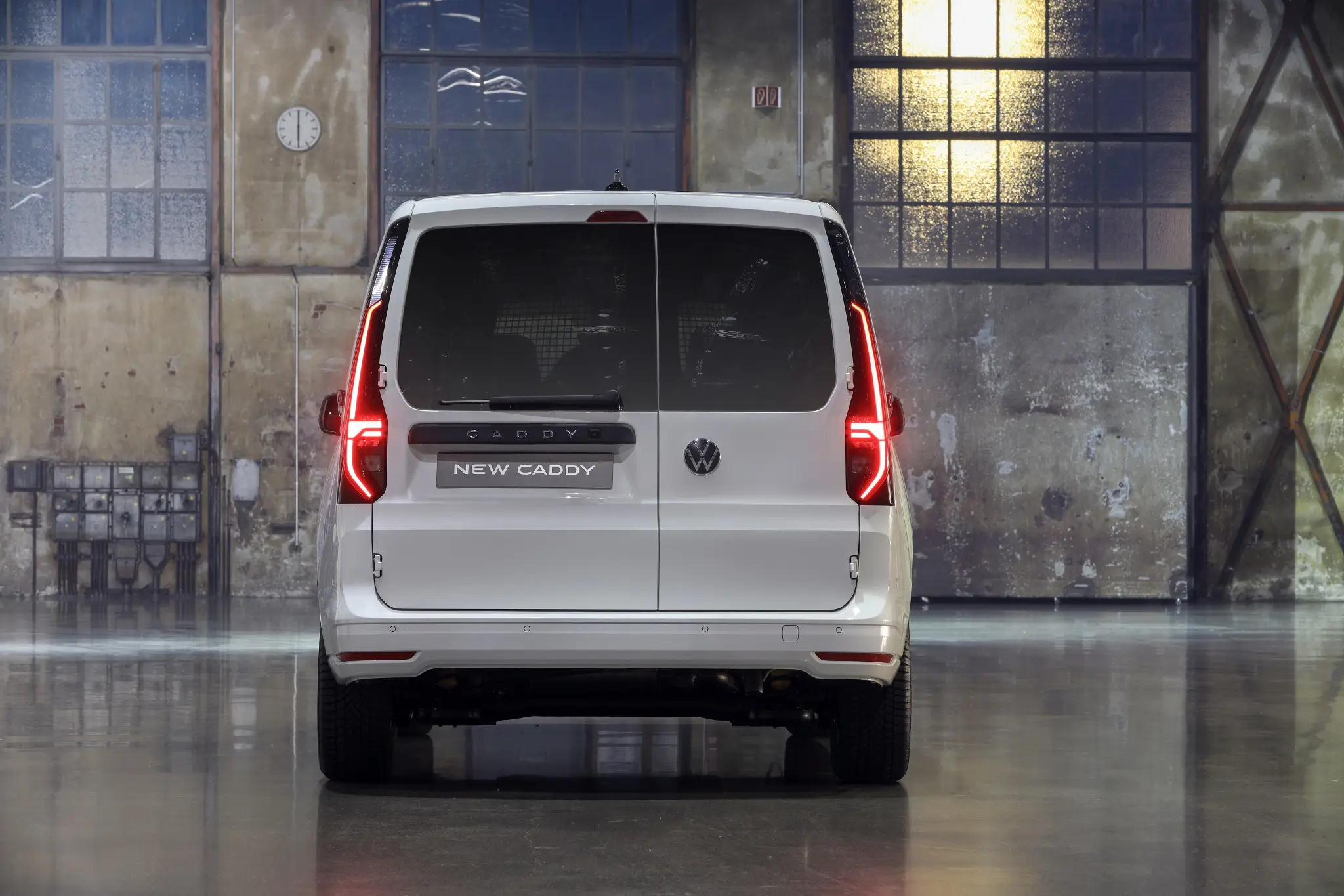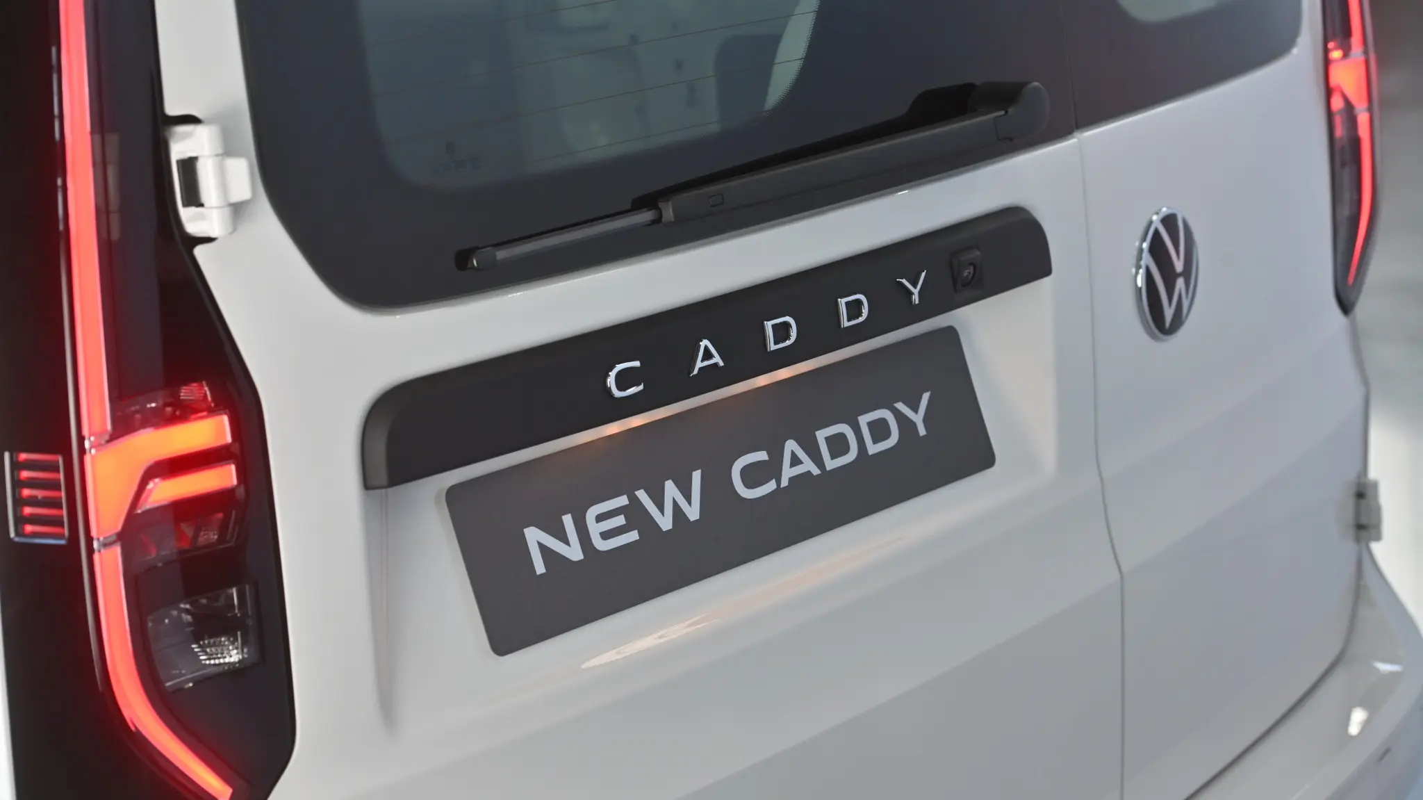 De Caddy generatie 5 heeft dan ook een echt nieuw gezicht, met een wat lagere, stompere neus. Het front is voorzien van een nieuwe bumperpartij, uitlopend in een soort honingraatstructuur naar onderen toe. Fraaie, vrij smalle lampen met LED-verlichting en een gesloten grille met het nieuwe VW-logo kenmerken de voorzijde van de Caddy. De lijnen die komen uit de koplampen lopen naadloos door in de lijnvoering op de voorspatborden. Daar, en ook in de lijn die over de hele zijkant van de carrosserie van de Caddy, is te zien dat Volkswagen echt een heel nieuwe koets heeft ontworpen. Aan de achterzijde zien we verticale, vrij smalle maar fraai ogende LED-lichten. Het persbericht rept over achterdeuren zonder ruit maar de preproductiemodellen tijdens de presentatie hadden die wel. Op de deurhendelunit op een van de achterdeuren staat groot de naam van het nieuwe model: CADDY.