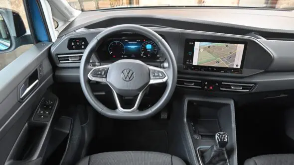Ook het interieur van de Caddy is volledig nieuw ontworpen. Opvallend aan het dashboard is de vele bergruimte op het dashboard, tegen de voorruit. Gezeten op de nieuwe AGR Ergocomfort stoelen zien we een fraaie digitale cockpit, helemaal voorzien van LED-displays. In het dashboard rechts van het stuur zien we een groot 10 inch scherm dat zo op het oog naadloos aansluit op het display achter het stuur. De passagiersstoel is neerklapbaar en krijgt zo een tafelfunctie. Ook in het midden, tussen de twee stoelen, is een brede console met voldoende opbergruimte, maar ook een startknop en een elektrische handrem.