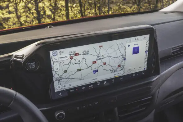 Dat stuur is een apart ding. Het is niet vierkant en niet rond maar ergens tussenin. Het ligt goed in de hand en biedt prima zicht op het digitale instrumentendisplay. In een doorlopend cluster is ook het 13 inch grote touchscreen met SYNC 4 gepositioneerd, vol met slimme tools voor de gebruiker. Het dashboard biedt flink wat opbergruimte, inclusief een ruim dashboardkastje rechts. De airbag voor de passagier is daarom verhuisd naar het dak.