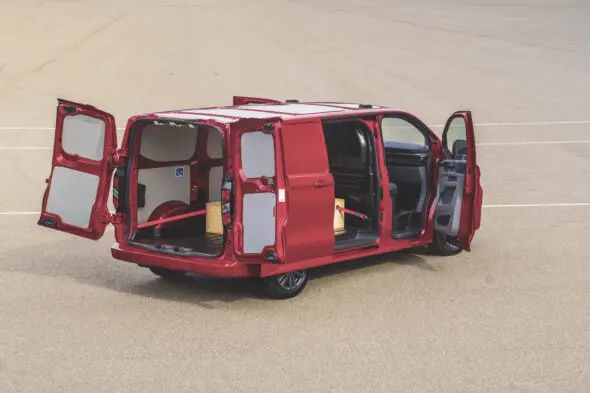 We kijken ook even in de laadruimte van de Transit Custom. De dimensies daarvan zijn amper veranderd, er is hoogstens een paar centimeter laadhoogte verloren gegaan. Ons testmodel, een L1H1 320 gesloten bestelauto van max. 3225 kg, heeft een laadvermogen van 1279 kg. Het trekkend vermogen ligt voor dit model op 2.500 kg.