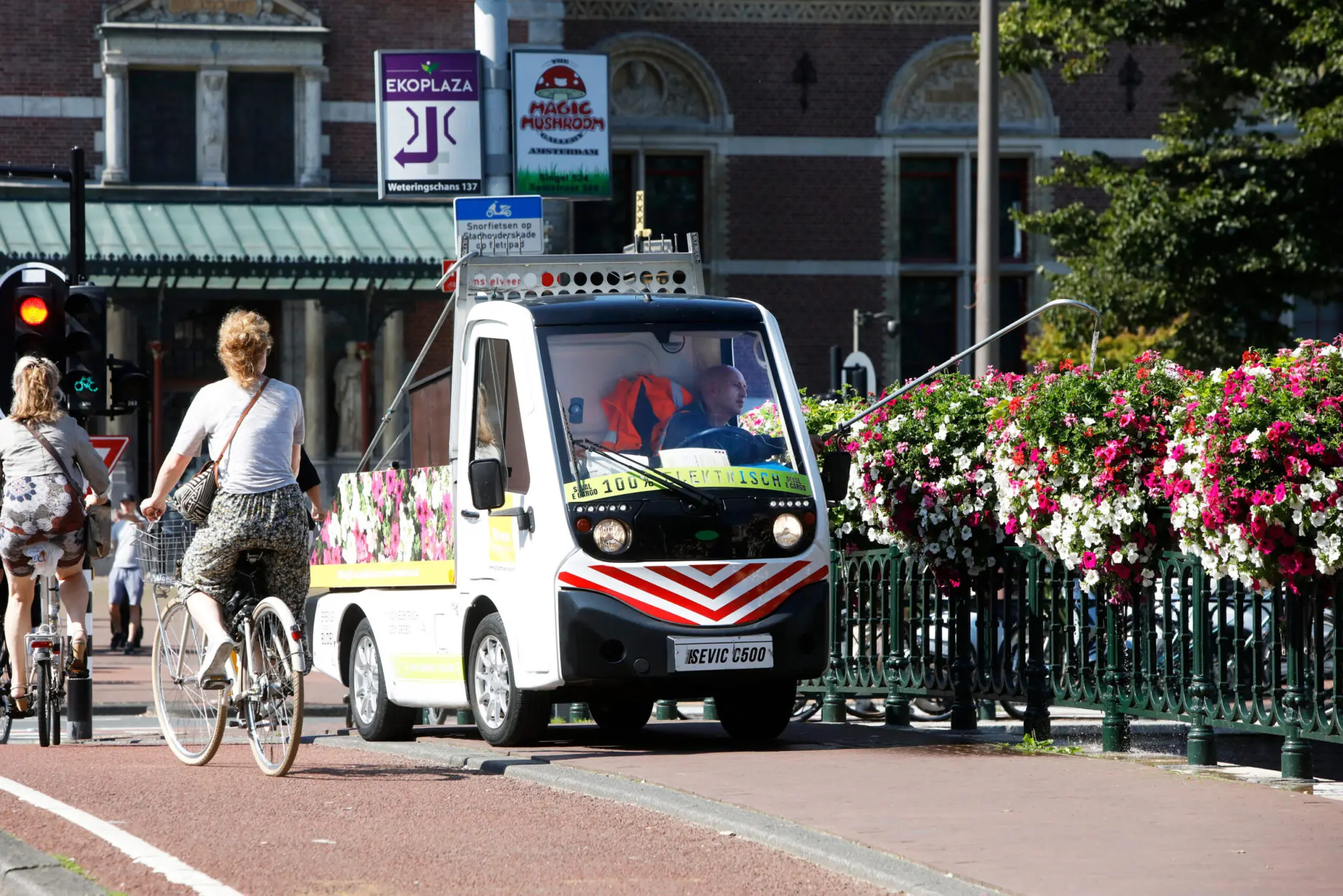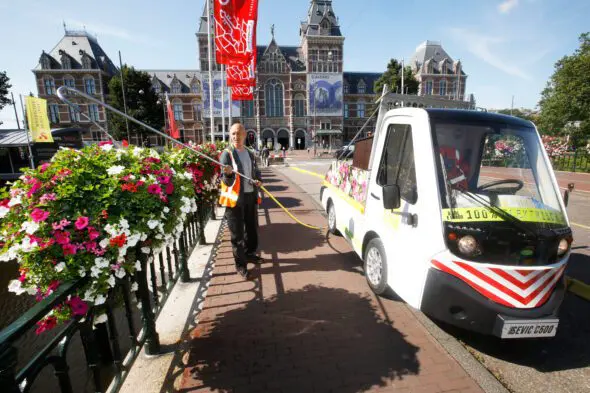 Het Betuwse groenbedrijf heeft in gezamenlijke opdracht van de gemeente Amsterdam, lokale ondernemers en hoveniersbedrijf Dolmans Wieringen Prins in diverse stadsdelen duizenden hanging baskets, brugbaskets en piramides aangebracht en zorgt daarbij tevens voor het onderhoud gedurende het bloeiseizoen. De gloednieuwe E-cargo, met een actieradius van 160 kilometer, werkt geluidloos. Chauffeur Marcin kan daarom vanaf ’s ochtends 05.00 uur op pad en geeft water zonder geluidsoverlast te produceren voor bewoners of voorbijgangers. De smalle wagen kan probleemloos door nauwe straatjes rijden. Na een proefperiode van 4 maanden is Amsterdam de eerste stad waar de E-cargo volledig wordt ingezet voor de verzorging van hanging baskets en bloempiramides.