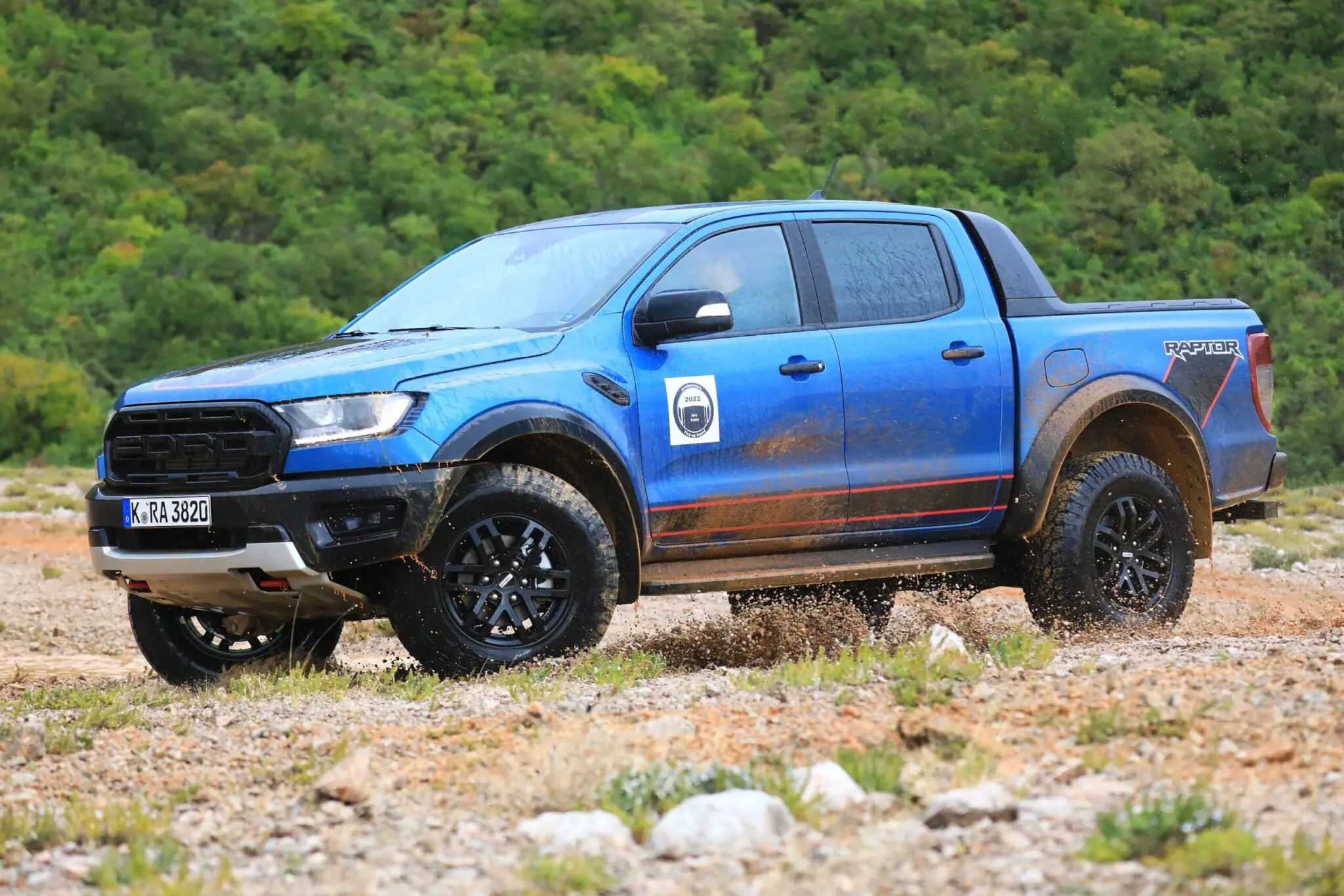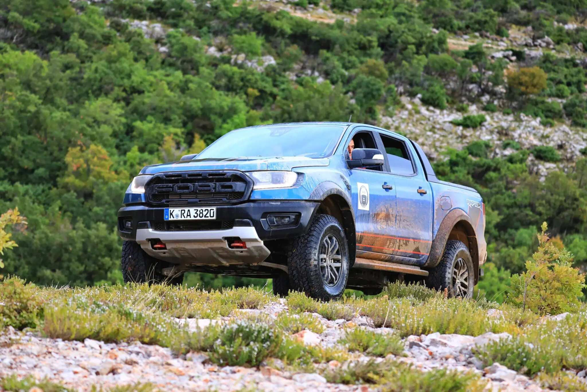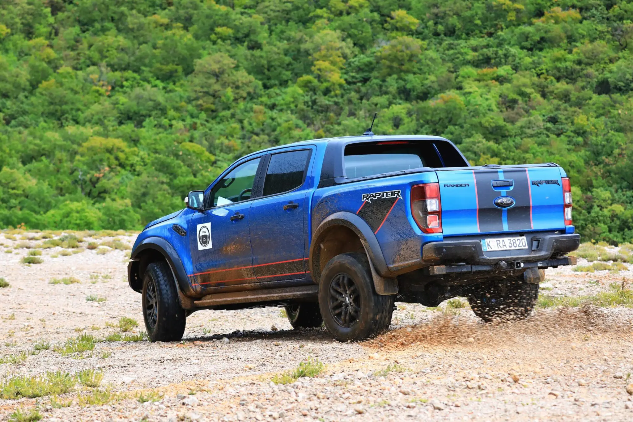 Ook te gast in Kroatië was de Ford Ranger Raptor in een Special Edition. Behalve de keuze uit de carrosseriekleuren Performance Blue (onze testauto), Conquer Grey en Frozen White is de Ranger Raptor Special Edition ook voorzien van twee matzwarte racestrepen met rode contrastlijnen op de motorkap, het dak, de flanken, de achterspatborden en de klep van de laadbak. Daarmee wordt het high-performance karakter van de pick-up extra benadrukt. Het ziet er gewoon erg stoer uit. Aanvullend op de racestrepen zijn de sleephaken aan de voorzijde uitgevoerd in rood, terwijl de brede wielkasten, de voor- en achterbumper, de portiergrepen en de kenmerkende Ford-grille zijn voorzien van een matzwarte afwerking voor een nog imposantere verschijning dan de standaard Ranger Raptor.