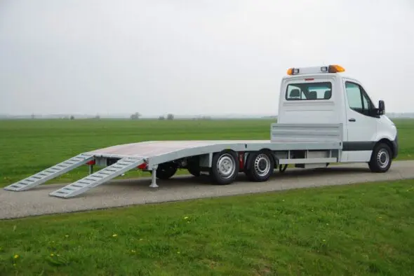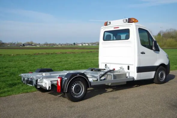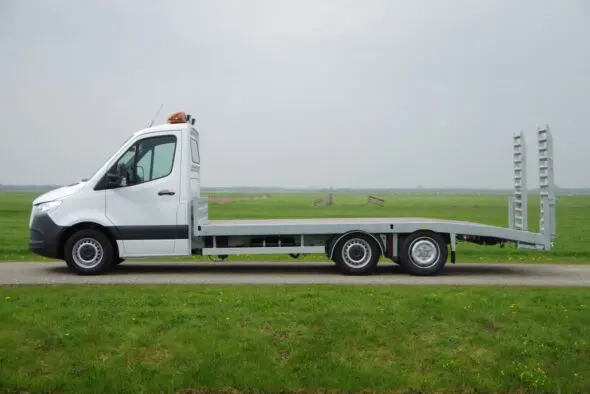 De 5 ton oplegger op deze lage auto is gebouwd met 1.500 kg schoteldruk en een luchtgeremde 3.500 kg as. Op deze as zitten de verlaagde banden 205/65 R 17,5” gemonteerd waardoor de laadvloer slechts 80 cm hoog is.
