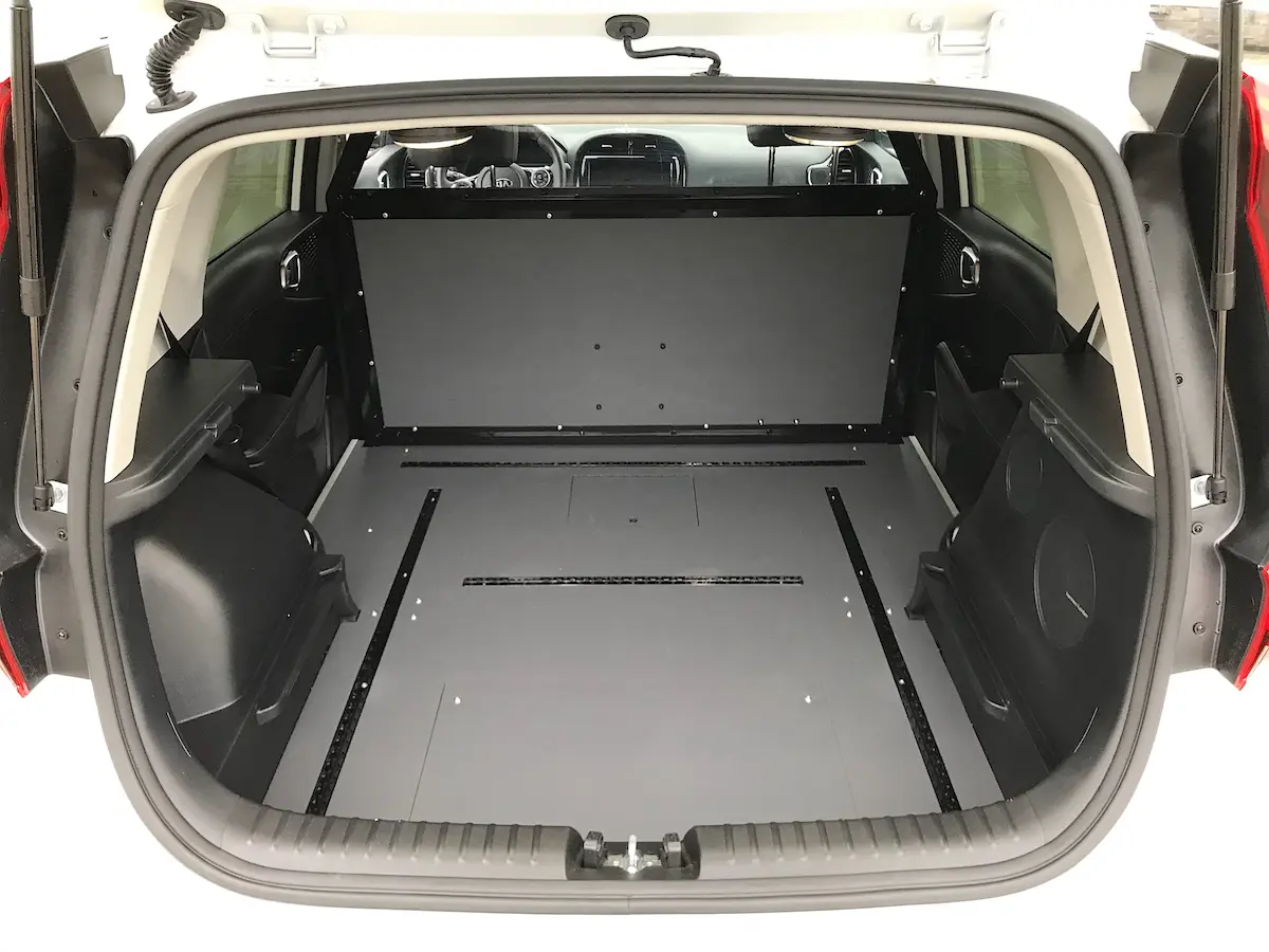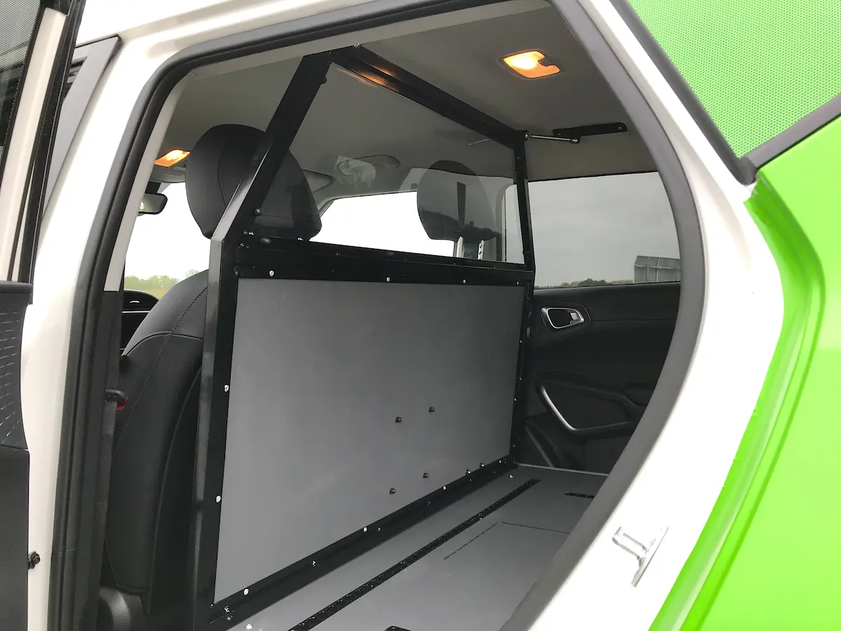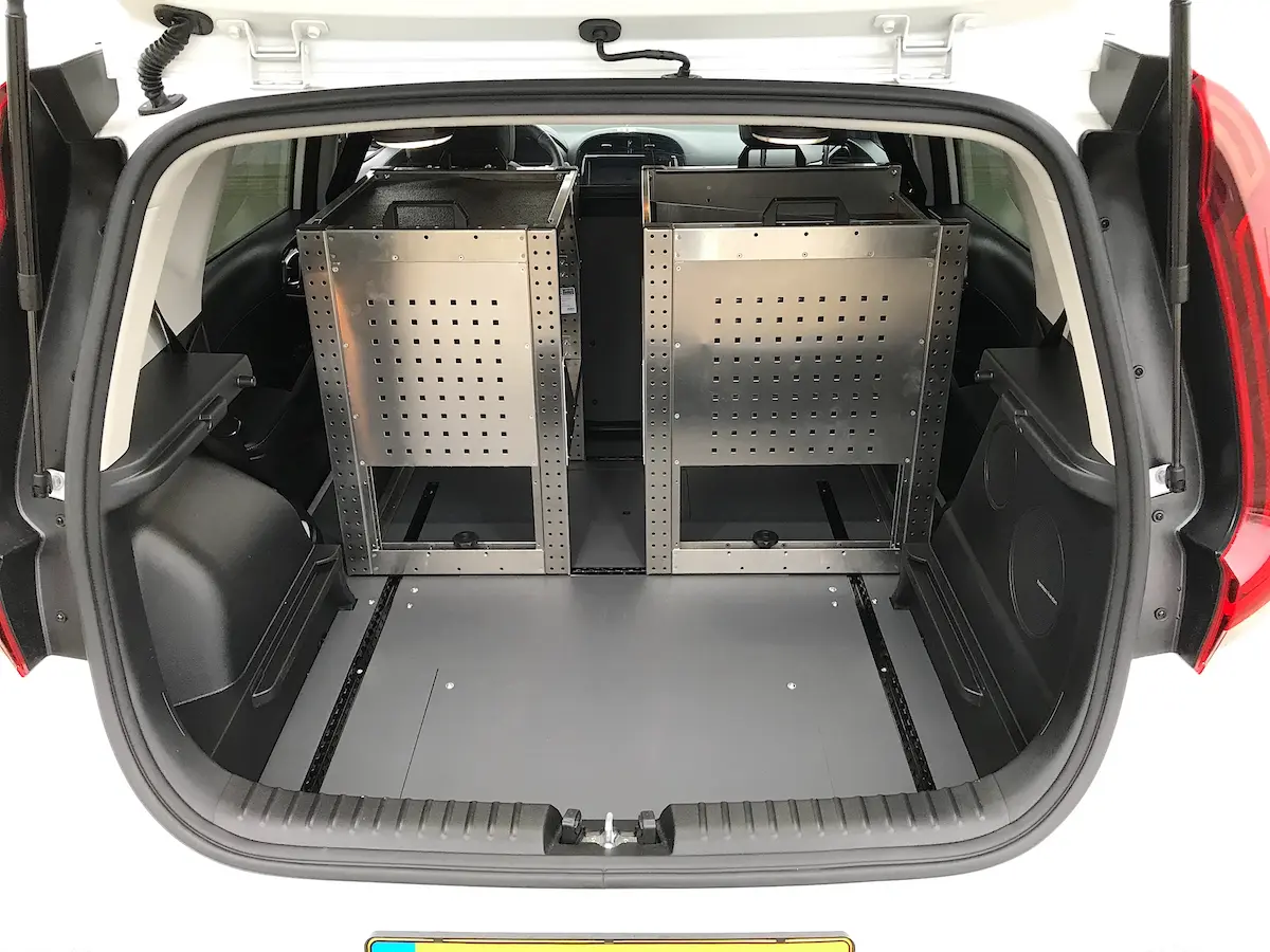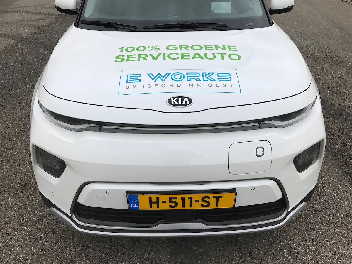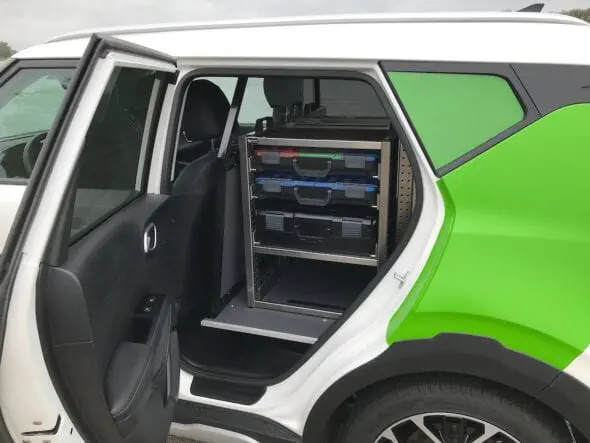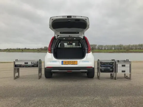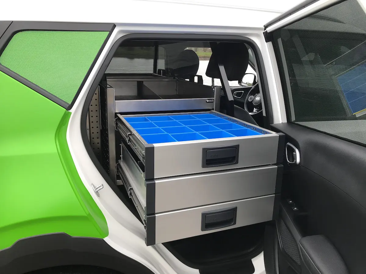 In samenwerking met Isfordink Olst bedrijfswageninrichting wordt een full elektrisch Kia e-Soul personenwagen vakkundig omgebouwd tot een bedrijfswagen met een laadruimte van liefst 1,35 m2. Het veilige scheidingsrek tussen de laadruimte en de voorstoelen zorgt voor een goede bescherming van de bestuurder en bijrijder.
