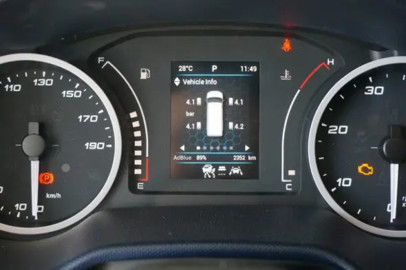 Achter het nieuwe stuurwiel zien we nog een nieuw TFT-kleurendisplay met veel informatie. Als we er doorheen klikken met de knoppen op het stuur komen we bijvoorbeeld het bandenspanningssysteem tegen. Dit systeem is leverbaar voor zowel enkel- als dubbellucht. Midden in het dasboard zien we nog een geheel nieuw Hi-Connect infotainmentsysteem, met een 7 inch touchsreen display. Het is uitgerust met een TomTom navigatiesysteem, een rijstijlanalyse, DAB-radio, het scherm laat het beeld van de achteruitrijcamera zien en ook DAB-radio hoort bij Hi-Connect. Heel modern is de koppeling met de smartphone via Apple Car Play en Android Auto.