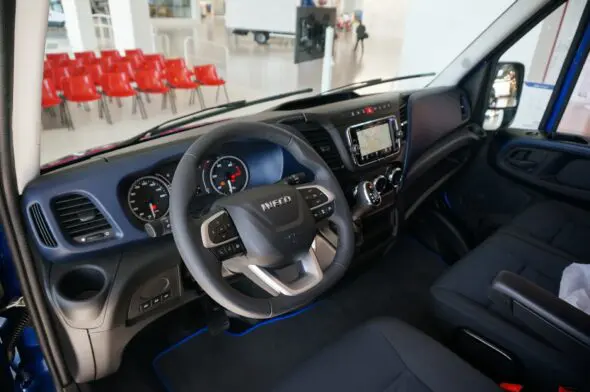Het interieur van de Daily is niet ingrijpend veranderd. Het dashboard is nog van het zelfde ontwerp, maar het doet nog steeds modern aan. Nieuw is het stuurwiel, iets kleiner van diameter en afkomstig uit de Fiat 500x. Het is lekker dik en voorzien van tal van knoppen, onder meer voor bediening van de telefoon en de adaptive cruise control. Praktisch is dat het stuur nu  in hoogte en diepte verstelbaar is. Naast het stuur vinden we nog een nieuwtje: een elektrische handrem. Weg is de grote hendel op de vloer. Volgens Iveco is de elektrische rem goed voor de productiviteit van de gebruiker en levert hij per maand 5 uur extra werktijd op. Een extra funtionaliteit van de handrem is dat hij nu ook gebruikt kan worden voor Hill-Descent.