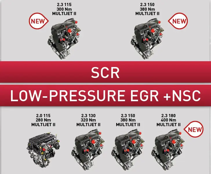 De lage-druk EGR Euro 6 dieselmotoren bestaan uit een 2.0 Multijet II van 115 pk, een 2.3 Multijet II van 130 pk, dezelfde versie met 150 pk en nogmaals de 2.3 Multijet II maar dan met 180 pk. Die laatste motor is helemaal nieuw en vervangt de huidige 3.0 liter motor. Alle motoren hebben een handgeschakelde zesversnellingsbak en zijn leverbaar met een automaat. De motoren zijn geschikt voor toepassingen tot wel 4,4 ton.