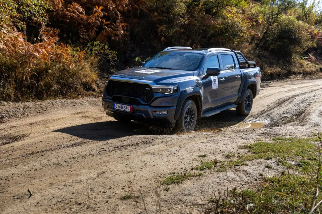 We stappen dan ook snel over in de Foton Tunland V9, en dat is echt een heel andere auto dan de G7. Hij is in alle dimensies groter dan de G7, oogt wat stoerder en valt eigenlijk een klasse hoger dan de G7. Hij is ook groter dan de andere deelnemers aan deze test en doet qua formaat een beetje denken aan een US pick-up. De handling van de Tunland V9 is veel verfijnder dan die van de G7. Dat komt deels ook door de hybride aandrijflijn. Die elektrokracht zorgt voor extra souplesse, zowel op het asfalt als in het terrein. Het is niet veel: de elektromotor levert 9 kW en 50 Nm, maar onder moeilijke omstandigheden is dat een wereld van verschil. De Tunland V9 komt met zijn prestaties in de buurt van Europese pick-ups, zijn kleinere broer kan daar alleen maar van dromen.