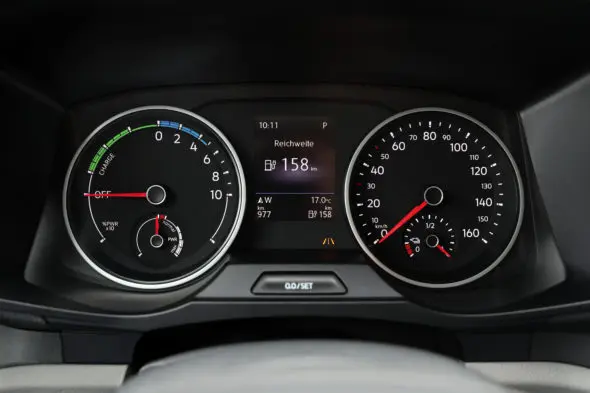 Al rijdend hebben we tijd genoeg om verschillende aspecten van de e-Crafter uit te proberen. Recuperatie van energie bijvoorbeeld als we het ‘gaspedaal’ loslaten. Bij het loslaten van dat pedaal wordt er op de motor afgeremd en wordt er energie teruggeleid naar de accu’s. Je kunt het zelf zien in een LCD-scherm op het instrumentendisplay. De mate waarin de aandrijflijn afremt, is echter minder groot dan bij andere e-bestellers in dit segment. Ook kan de mate van recuperatie niet worden ingesteld, en is er ook geen ‘Eco-modus’. Daarmee kan bijvoorbeeld het motorvermogen licht worden geknepen en de verwarming of airco minimaal worden ingeschakeld. De e-Crafter heeft het allemaal niet, en daar is een goede reden voor. Volkswagen heeft de e-Crafter voor de marktintroductie eerst laten testen in de praktijk, door 25 Europese fleetowners, in Nederland door acht klanten met grotere vloten. Daaruit bleek dat bestuurders helemaal niet op van die extra mogelijkheden zitten te wachten. Best opmerkelijk vinden wij, maar dit en ander onderzoek van Volkswagen naar klantenwensen is intensief geweest, dus moeten we de uitkomsten ook accepteren.