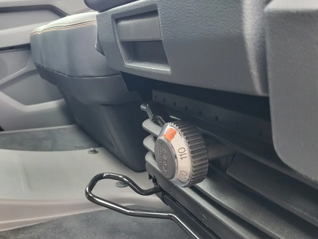 Het sportieve karakter van de Commander GT vinden we ook terug in het interieur, met een luxe leren stoel en bijrijdersbank in passende kleurstelling, compleet met oranje stiksels. De bestuurder wordt helemaal verwend, met extra armsteunen, luchtvering en een uitschuifbare zitting. We zien veel opbergruimte in en op het dashboard en ook in de deuren. Bovendien profiteert de auto van de meest recente update die MAN vorig op de TGE doorvoerde. Zo heeft de TGE nu een digitaal instrumentendisplay en staat er midden op het dashboard een 12,9 inch groot multimediasysteem. De TGE is ook voorzien van een nieuwe elektronische inrichting, waardoor slimme, al dan niet verplichte assistentiesystemen nu ook op de TGE zitten. De bliepjes die daarbij horen zijn via het scherm vrij gemakkelijk uit te zetten. De 8-gangsautomaat is te bedienen met een hendel aan het stuur.