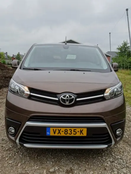 Het gaat bij een bestelauto natuurlijk nooit primair om het design, maar een leuk smoeltje is wel meegenomen. Dan ben je bij de Toyota ProAce niet aan het verkeerde adres. PSA en Toyota hebben besloten om alle drie de auto’s een eigen look te geven aan de voorzijde. Toyota heeft ervoor gekozen te gaan voor een grille en koplampen die overeenstemt met andere modellen in de Toyota familie. Ook een lichtgrijzen module in de onderbumper draagt bij aan een stoere look voor de ProAce, die echt een eigen, onderscheidend gezicht heeft. Als we nog een rondje lopen om de ProAce zien we maar weinig wat hem apart zet van de PSA-tweeling. De wieldoppen geven de auto een beetje cachet, aan de achterzijde maken enkel een groot Toyota-logo en de typenaam ProAce het onderscheid. De bruine lakkleur is misschien niet ieders smaak, opvallend is hij wel in de verder voornamelijk witte Nederlandse bestelautovloot. Weer aangekomen bij de voorzijde kijken we nog we even onder de smalle motorkap. Daar ligt de 1.6 D-4D dieselmotor, goed voor 115 pk. Ook deze motor is afkomstig van PSA. Daar doen de merken allemaal niet moeilijk over, want de drie logo’s van de automerken staan prominent naast elkaar op diverse onderdelen.