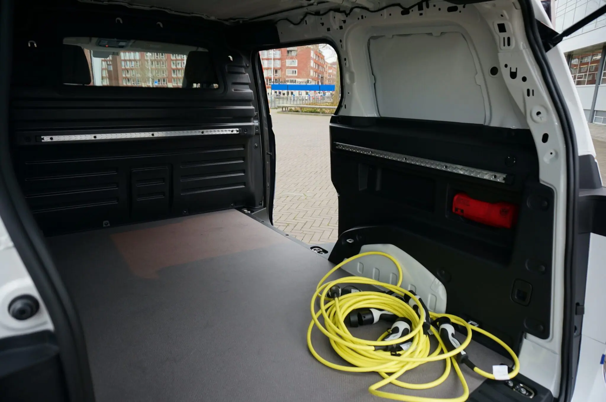 We kruipen voor vertrek ook even op de grond om onder de auto te kijken. Daar zien we het 77 kWh accupakket zitten. Op de achteras, niet zichtbaar natuurlijk zit de elektromotor, goed voor 150 kW (205 pk) vermogen en een koppel van 310 Nm. Dat is dezelfde aandrijflijn als ook de ID.3 en ID.4 heeft, dus we verwachten dat die specificaties overeen komen. Volkswagen geeft nog geen gegevens vrij over de actieradius, maar als we een beetje rekenen rond de actieradius van de genoemde elektrische personen-VW’s, dan komen we uit op een nominale actieradius van 450 tot 500 km. Dat zou meer dan voldoende zijn voor een dag weken met de ID.Buzz Cargo. Hier in Amsterdam met temperaturen rond de 7 graden toonde het display bij volle accu’s overigens een range van 350 km.