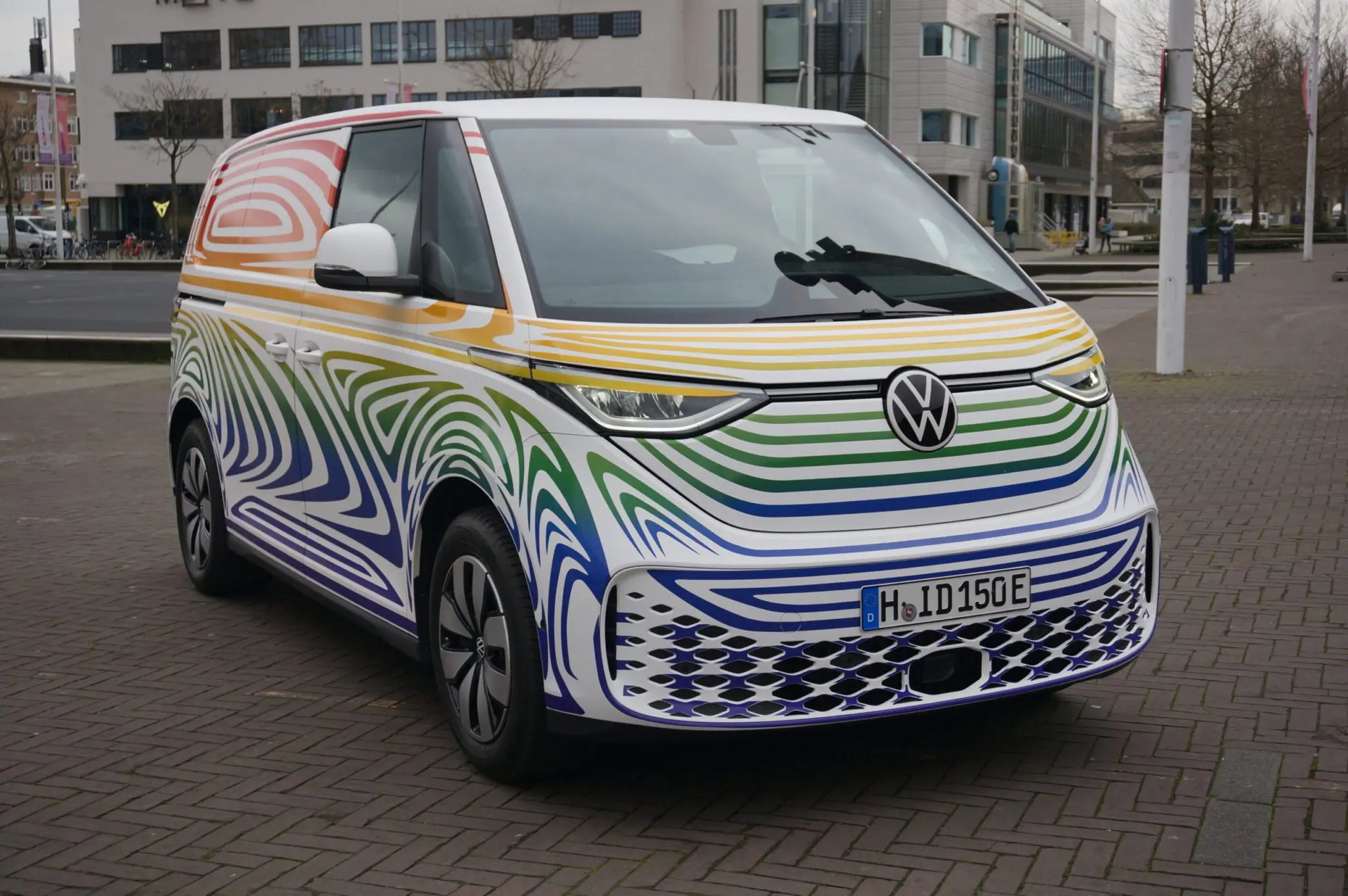 Volkswagen liet een tour met een gecamoufleerde versie van de ID.Buzz, zowel in personenauto- als cargo-versie, langs diverse Europese hoofdsteden gaan en deed ook Amsterdam aan. Deze ‘covered drive’ gaat om een prototype, met felgekleurde camouflageprint. Ondanks de camouflage is de carrosserie goed zichtbaar. De ID.Buzz is gebouwd op het MEB-platform van VW en is in totaal 4,71 m lang. De breedte is 198 cm, de hoogte 194 cm. De wielbasis bedraagt net geen 3 meter en dat betekent dat de wielen van de ID.Buzz zowat op de hoeken staan. Het moet zorgen voor veel binnenruimte voor zowel passagiers als lading.