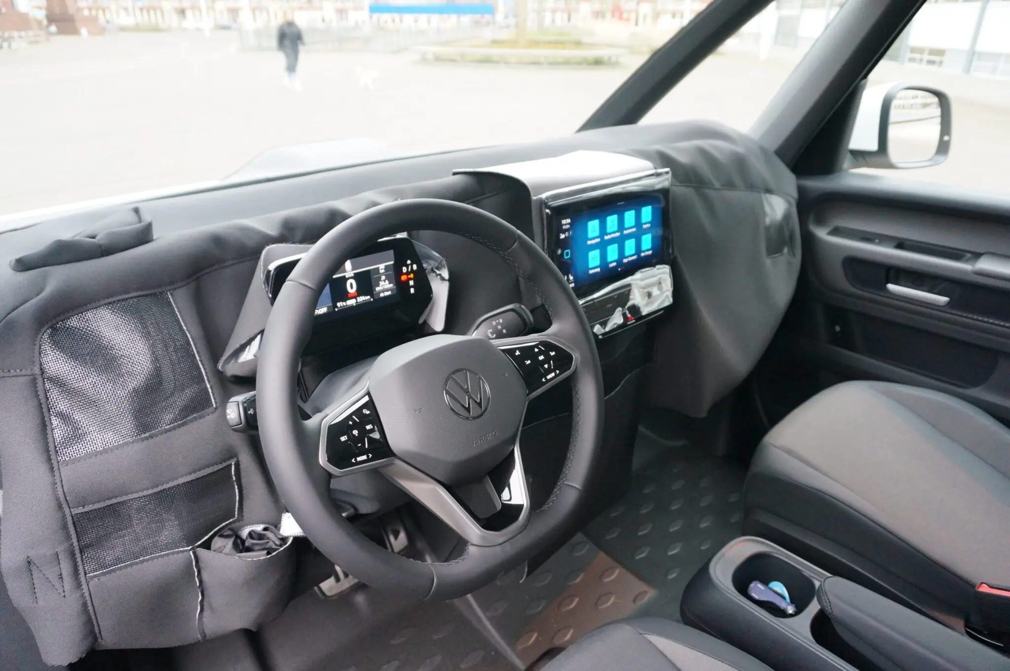 Instappen dan maar, en daar krijgen we te maken met nog veel meer camouflage. Het hele dashboard is afgedekt en we mogen er echt niet onder kijken. Toch maken we twee displays vrij voor informatie tijdens het rijden. Achter het stuur zit hetzelfde display als in de ID.3 en ID.4, met alle info die we nodig hebben om veilig te kunnen rijden. In het midden van het dashboard een 12 inch groot scherm, voorzien van de bekende app menustructuur zoals we die ook kennen uit de Caddy en de ID.3 en ID.4. Op het stuur de bekende knoppen voor cruise control en audio. De stoelen zitten goed en hebben hetzelfde veiligheidssysteem als bij de ID.3 die we eerder reden: ga je als bestuurder van je stoel af of klik je de veiligheidsgordel niet vast, dan schakelt het voertuig zichzelf automatisch uit.